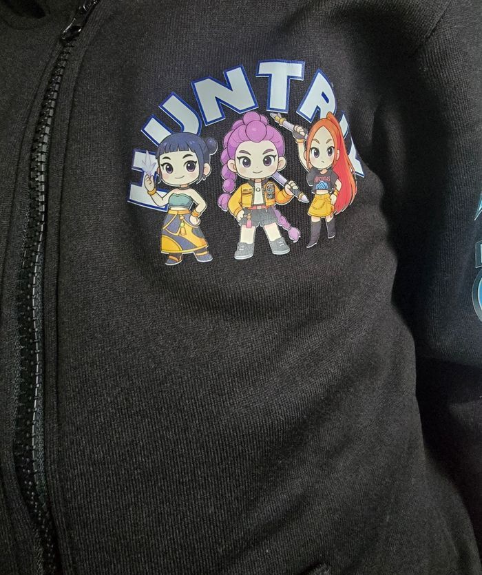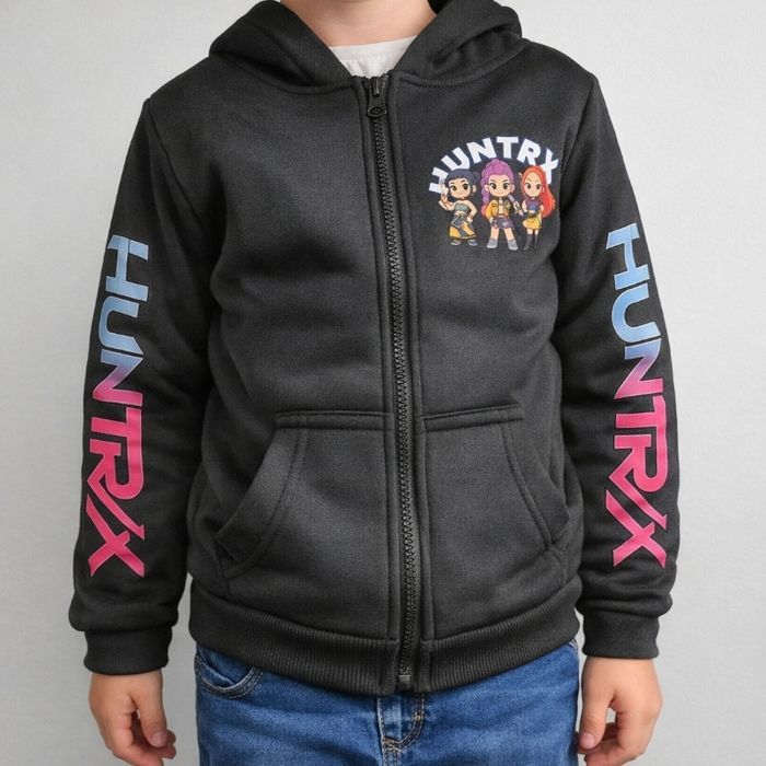 Sweat à capuche ultra tendance noir et fushia, avec imprimés HUNTRIX devant, sur les manches et un grand visuel stylé au dos. Coupe confortable, matière douce, parfait pour un look streetwear inspiré K‑pop / anime. 🧵 Détails - Taille : 100 cm taille grand - Couleur : noir et fushia - Style : Streetwear / K‑pop / Anime - Imprimés : Personnages + logo HUNTRIX - Fermeture : zip