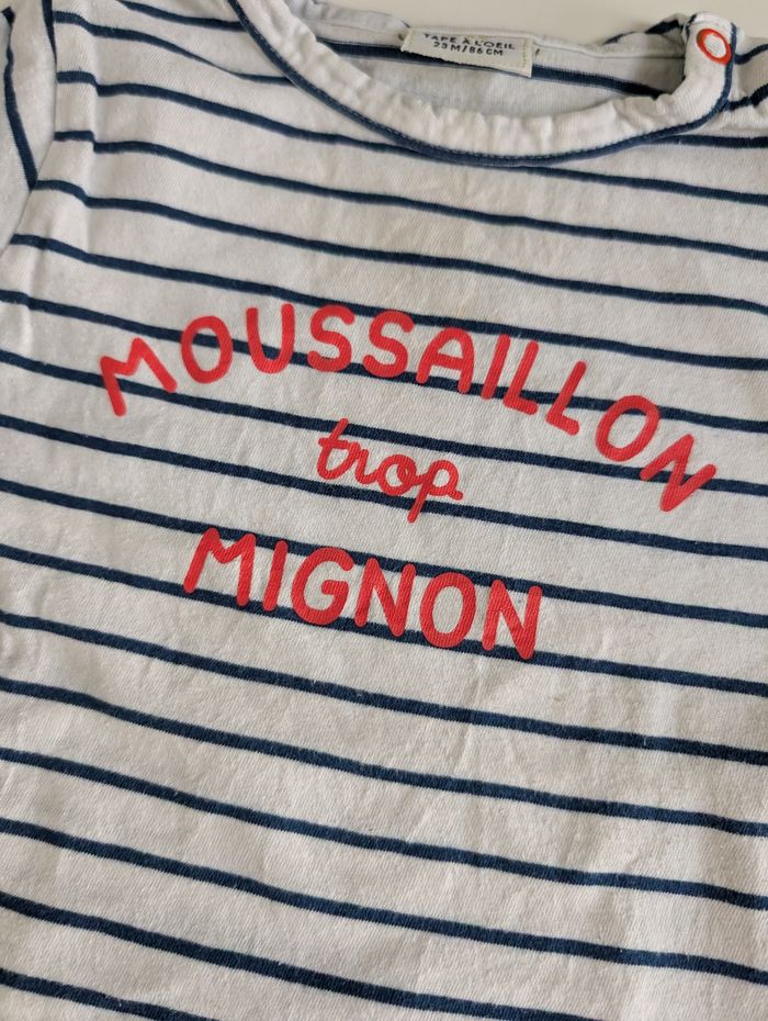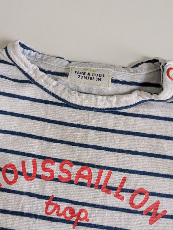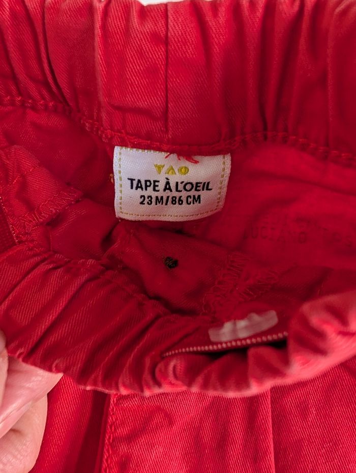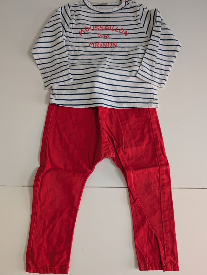 Ensemble deux pièces. Pull blanc a rayures bleues et jean rouge. Taille 23 mois, tape à l'oeil. En très bon état.