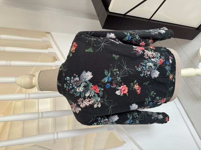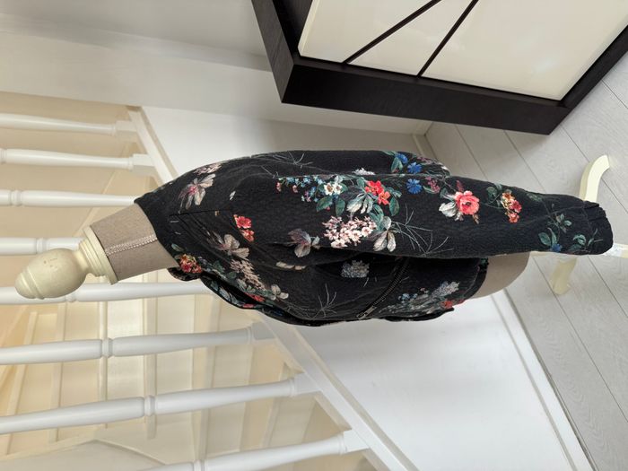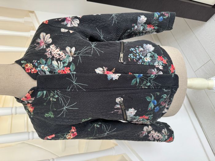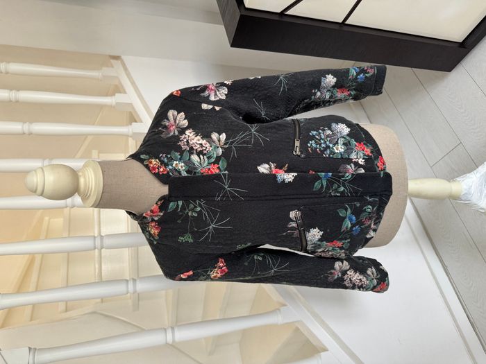 Blouson Mango noire à fleurs multicolores taille S. Largeur des aisselles : 49cm. Longueur : 59cm. En très bon état, porté une ou deux fois avec soin, taille correctement.