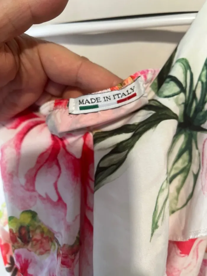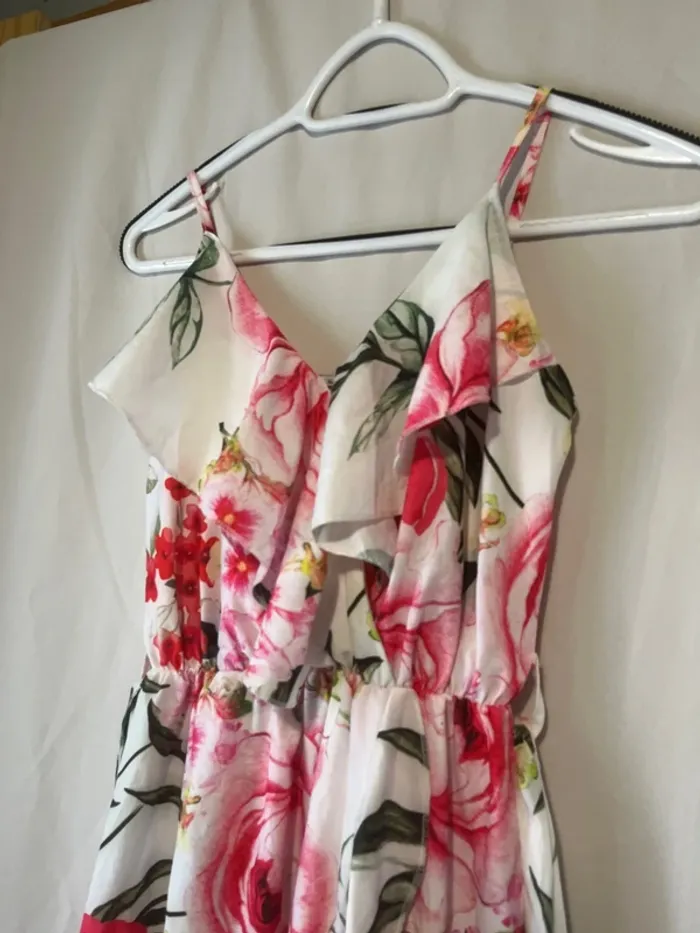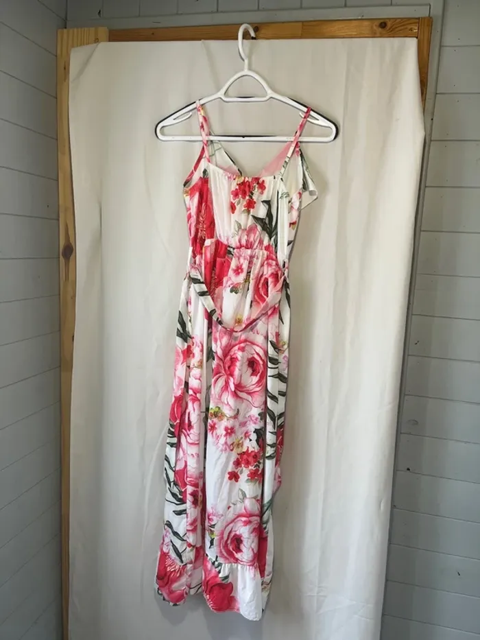 Robe longue Blanche imprimée fleurs roses Taille 38 cm Ceinture Volant sur la poitrine Aisselle à aisselle 42 cm Longueur 125 cm
