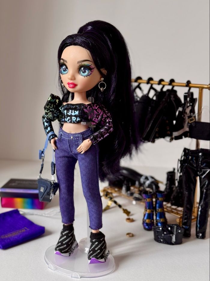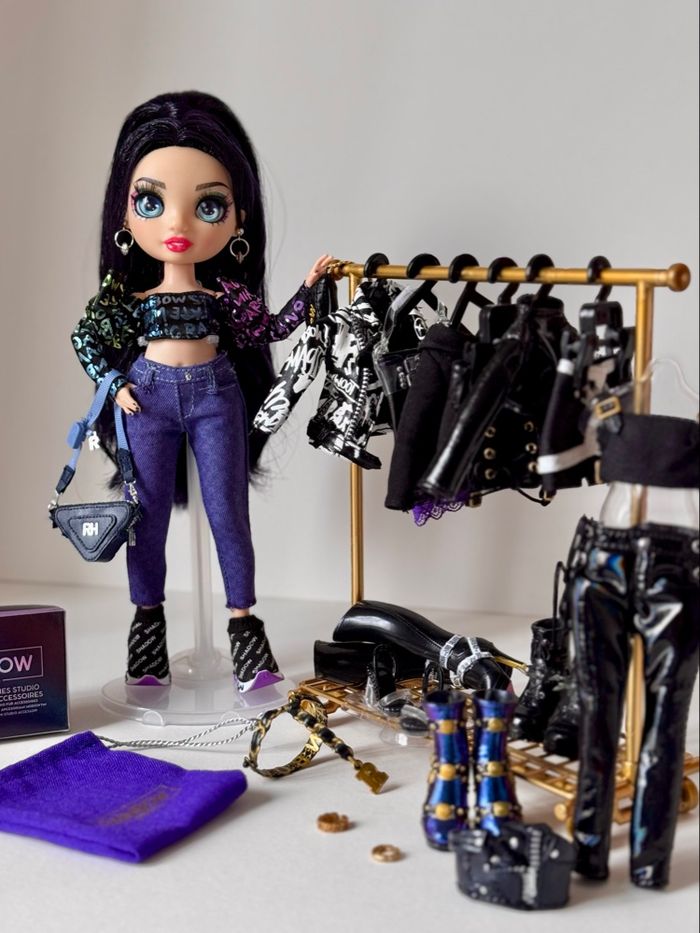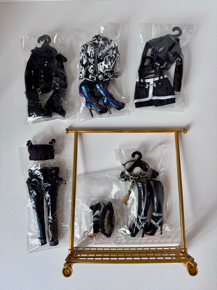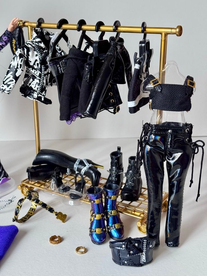 Occasion en très bon état. La poupée comprend ses 4 tenues d’origine complètes + une, un portant à vêtements et des boucles d’oreilles en métal. Maison non fumeur, envoi rapide et soigné