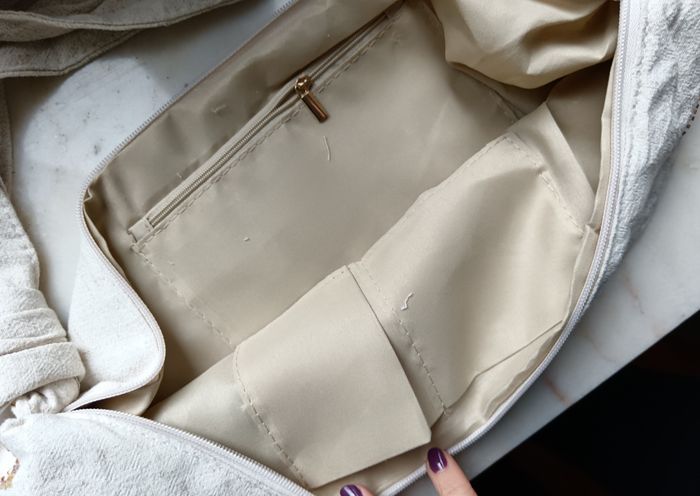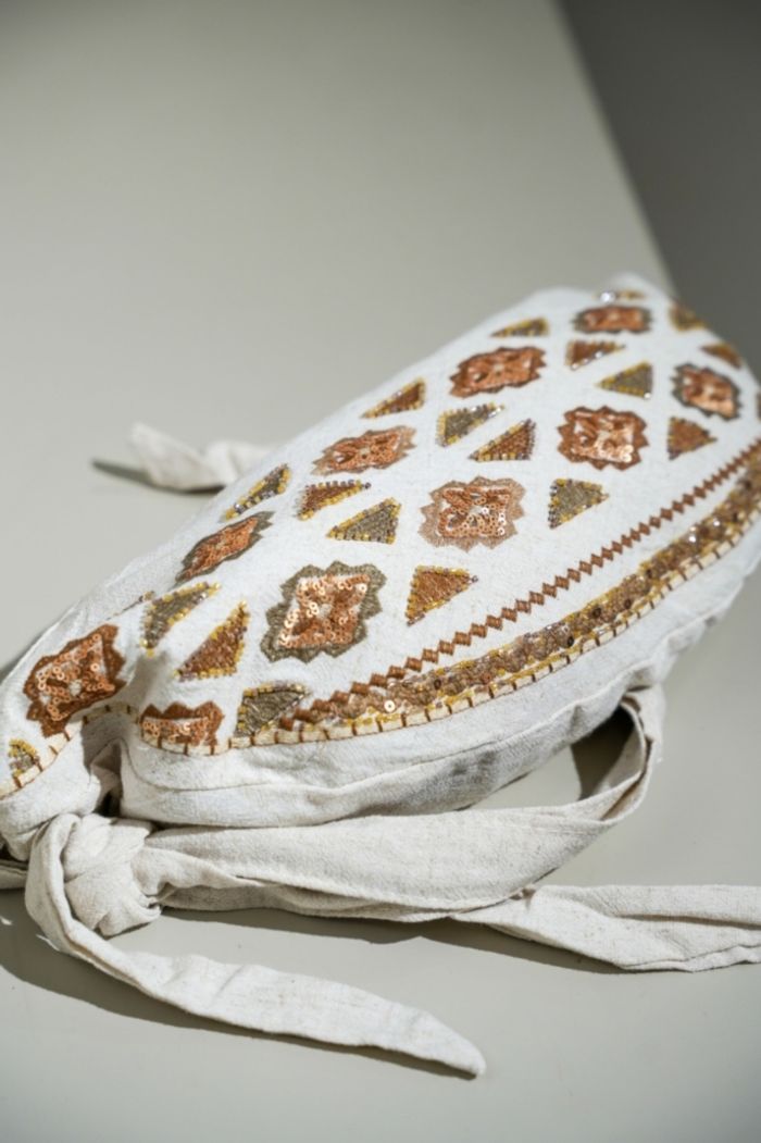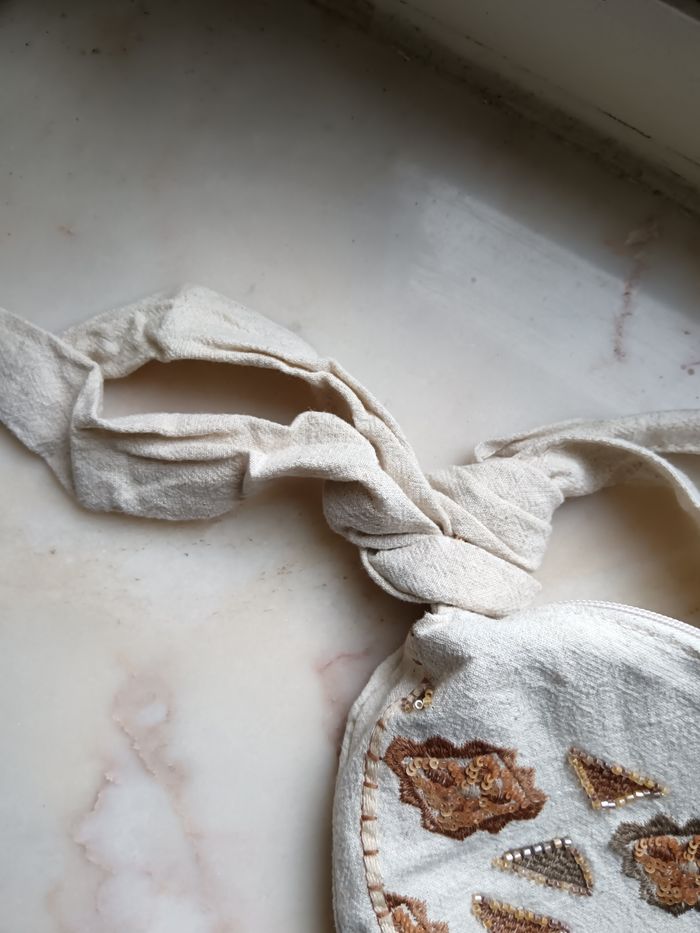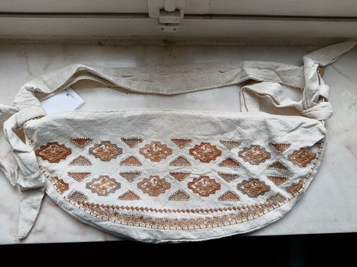 Banane / sac en lin Sequins, perles et broderie En lin beige, zip doré Une poche zippé a l'intérieur Bandoulière réglable Hauteur 17 cm/ Largeur 28 cm