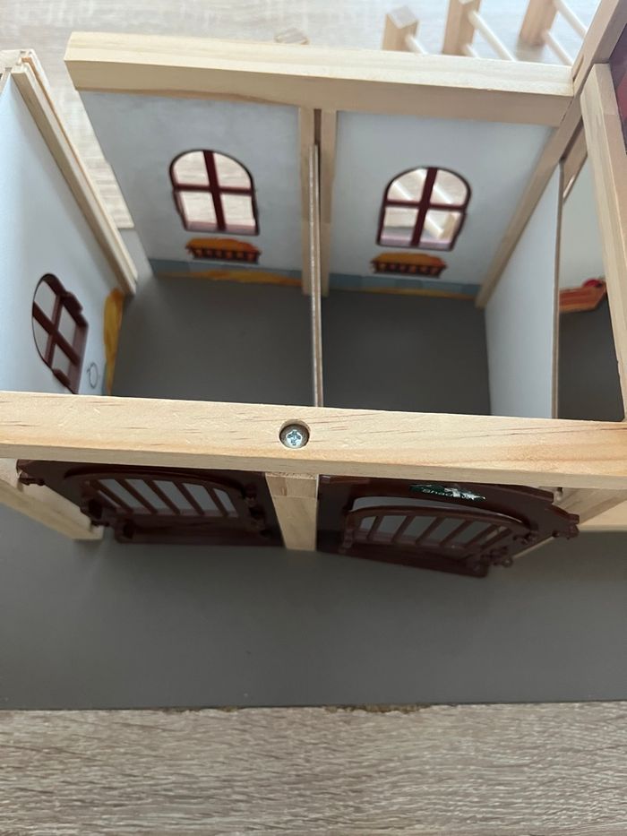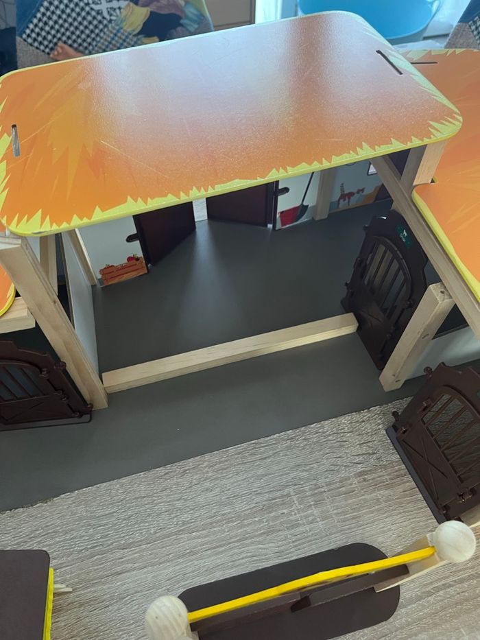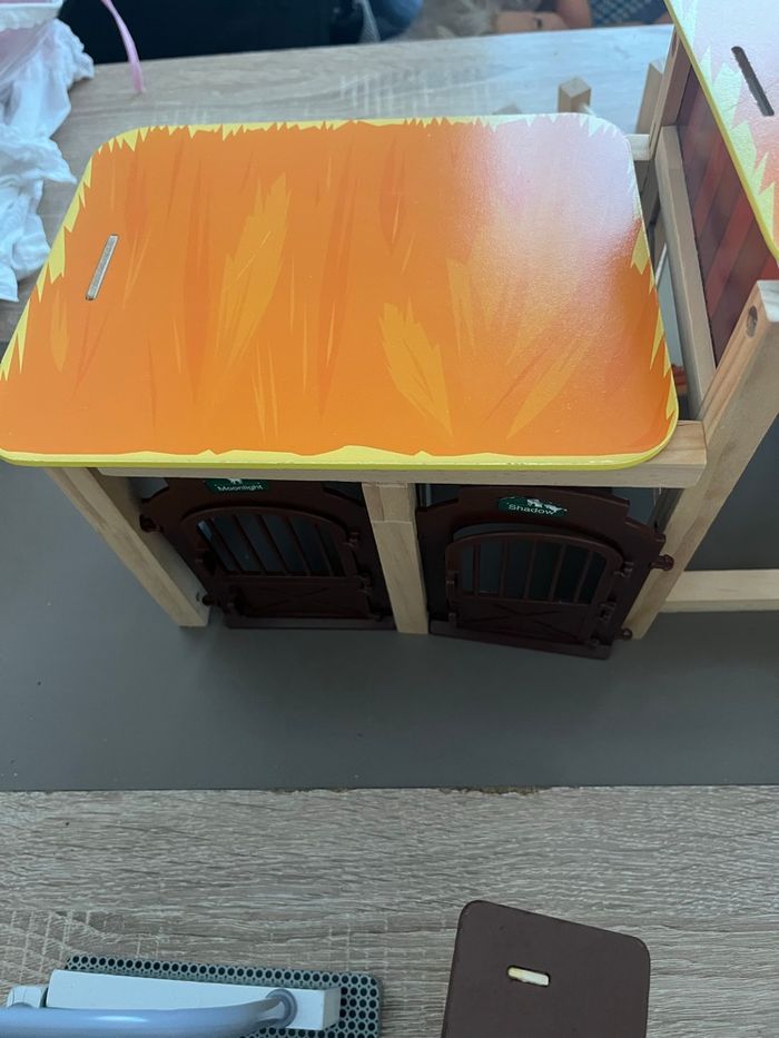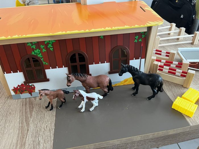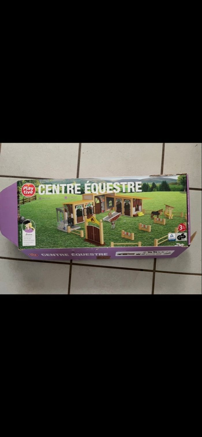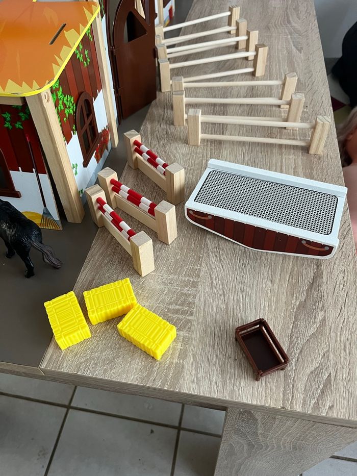 Bonjour, très joli centre équestre en bois. En très bon état. J’ai fait des photos pour vous montrer que tout en bois est présent. Rangé dans son carton d’origine je n’ai pas mis les visses pour les photos mais elles sont fournies avec. C’est un jeu qui a été utilisé. Des points de colle ont été posées pour des petites pièces et en démontant deux petites pièces sont à recoller. Il manque la couverture d’un cheval et les deux petits légumes. La notice de montage est jointe, c’est vraiment pas difficile. Deux pièces seront rajoutés dans le carton d’envoi car montées impossible de les remettre dans le carton d’origine. Si question, n’hésitez pas à me.