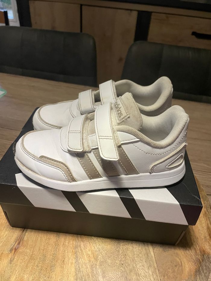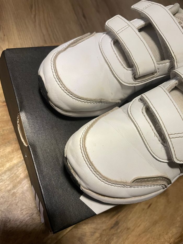 Baskets enfant adidas en bon état car juste la languette devant est un peu décollée ( voir photo ) De pointure 30
