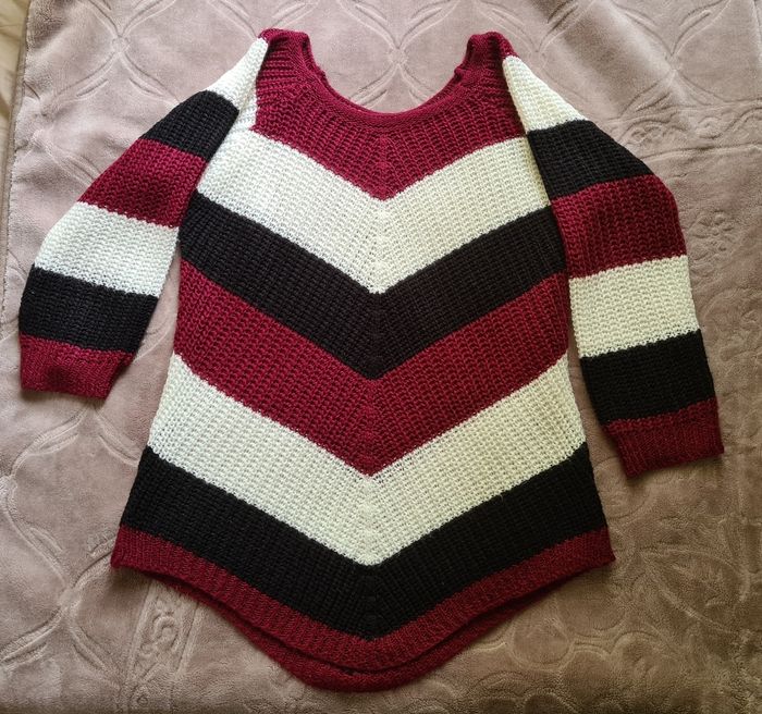 Pull tricolore noir bordeaux et blanc légèrement transparent arrondi vers le bas Taille 36 38 (56cm d'aisselles à aisselles et 70cm de long) Neuf jamais porter dans un excellent état Pour plus de renseignements n'hésiter pas Envoi rapide