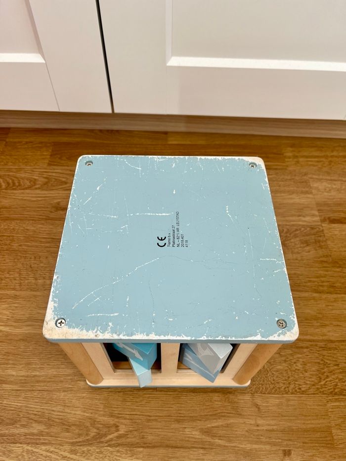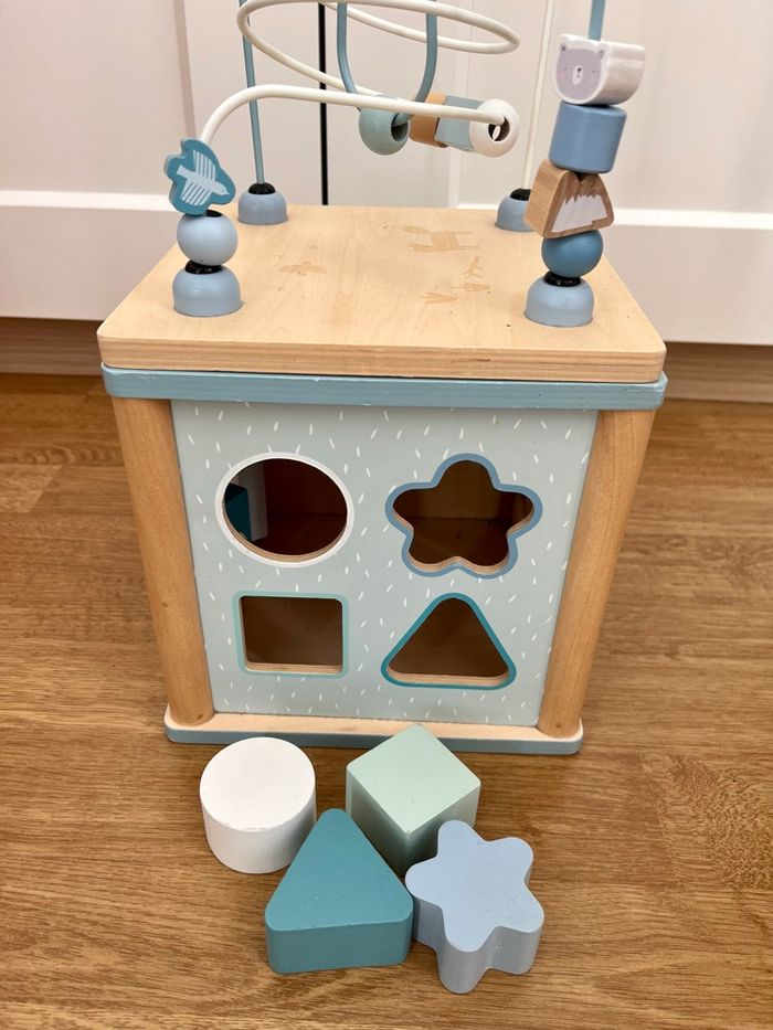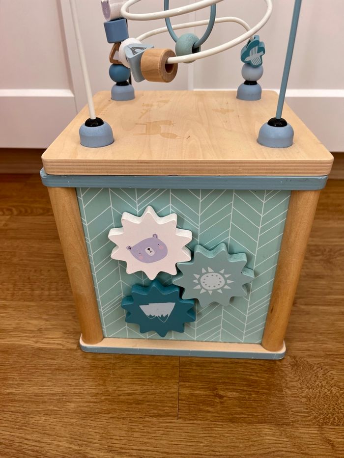Cube d’activités Little Dutch - 1 trieur de formes. - Jeu d'engrenage (roues dentées) - Piste de perles - Couvercle amovible - La piste de perles peut-être placée à l'envers Peinture abîmée en dessous et légèrement sur les côtés Dimension : 20 x 20 x 40 cm