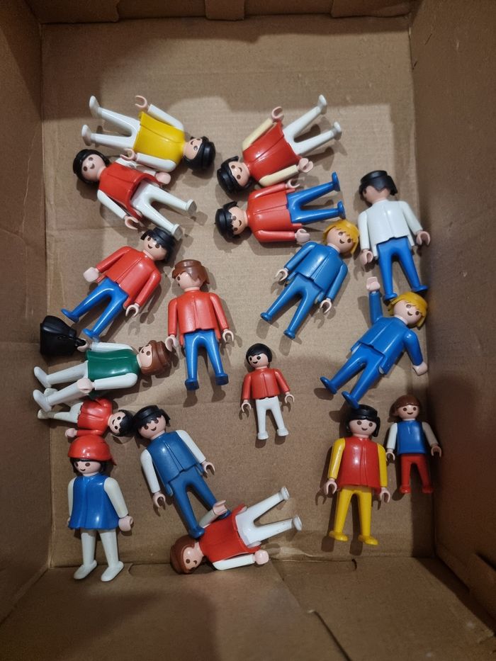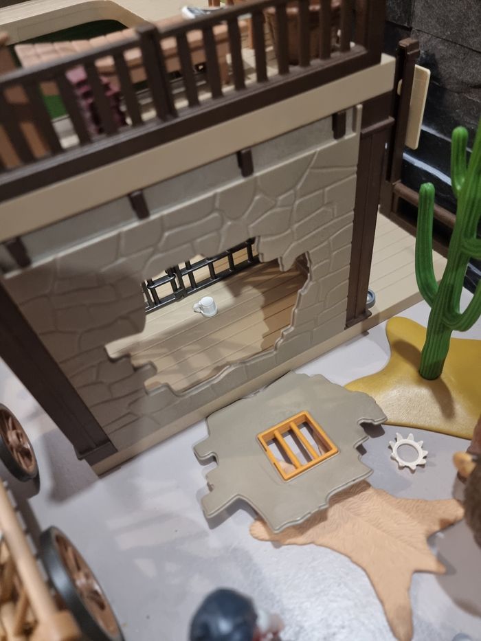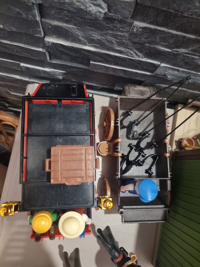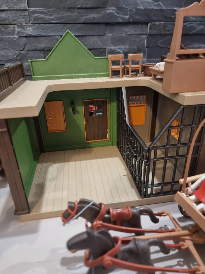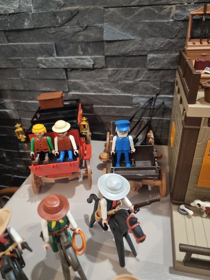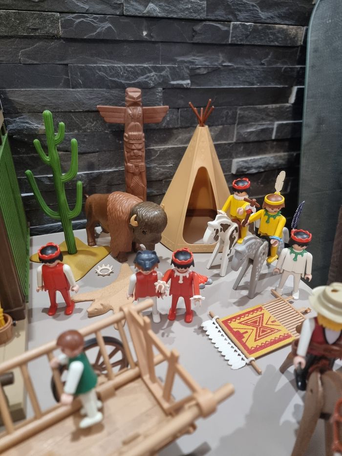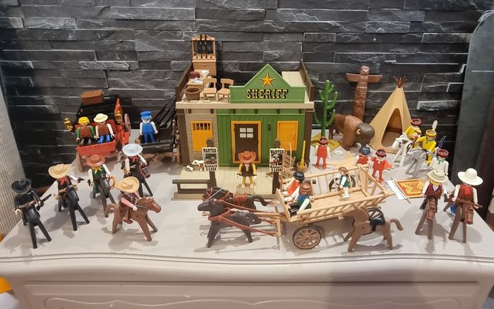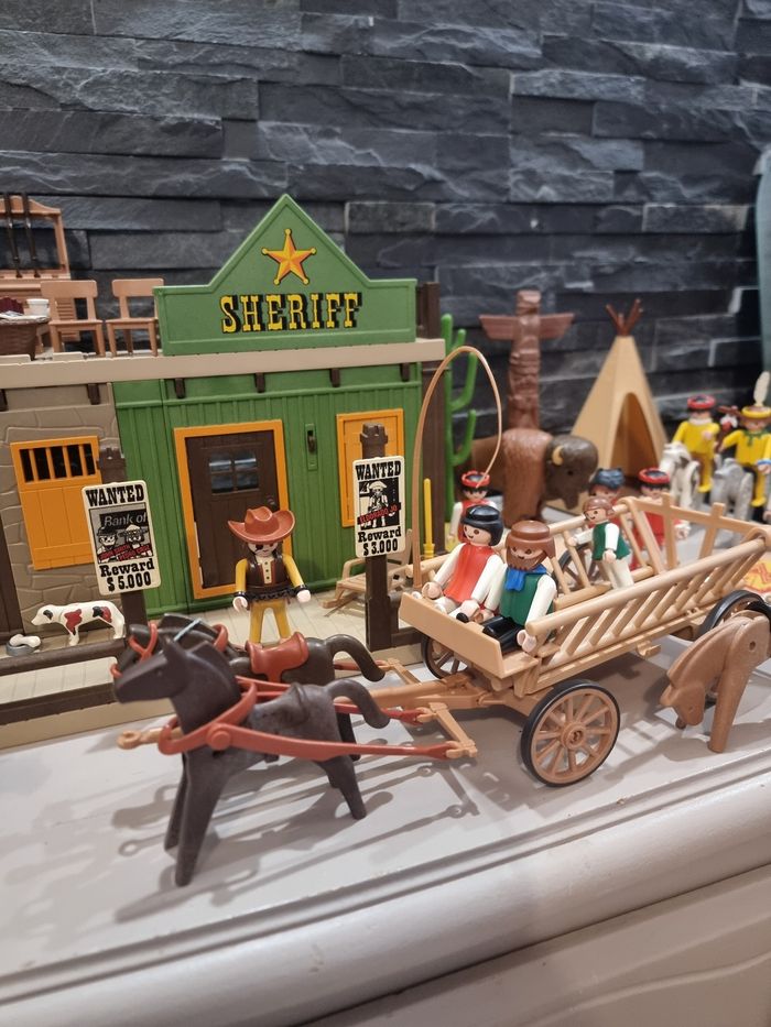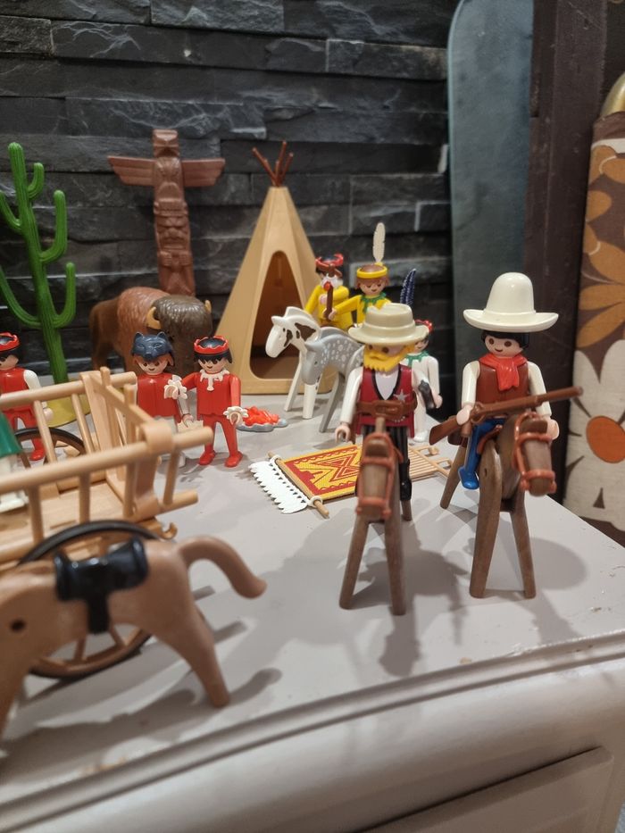 Lot playmobil western avec indiens, tipi, bison, totem, chevaux , cowboy, shérif, prison, calèches etc + plusieurs personnages anciens. Bon état, manques des pièces à la prison, les 2 calèches à l'arrière n'ont pas la barre pour attacher des chevaux, 1 tige brune au tipi, des petits bouts cassés (voir photos : 1 accroche du tapis indiens, bout d'une corne du bison, un clip sur le toit de la diligence) Vendu en lot dans l'état
