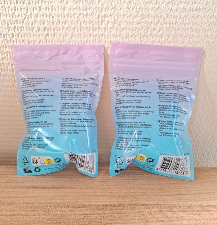 Je vends un lot de 2 paquets de houppettes de nettoyage pour le visage venant de chez Action. Chaque paquet contient 2 houppettes (une rose et une turquoise). Les deux paquets sont neufs, jamais ouvert.