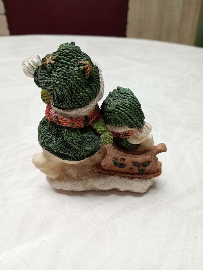 Décoration de Noël. Deux bonhommes de neige faisant de la luge. Hauteur : 11 cm. Très bon état.