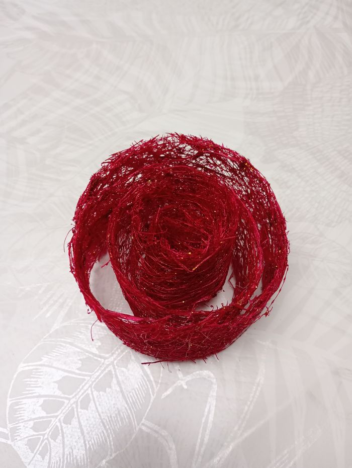Ruban de décoration, rouge avec paillettes dorées. Dimensions : 83 cm x 5 cm. Très bon état.
