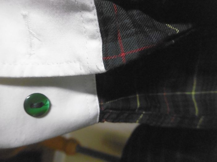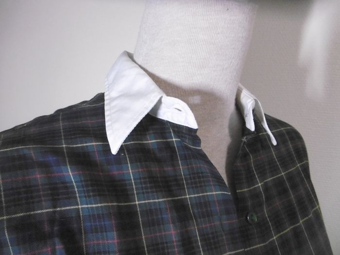 fil à fil chemise écossaise carreaux vert et marine avec col blanc et revers au poignet en coton blanc uni , il manque 1 des boutons au poignet ( voir photo) autrement bon état d occasion , étiquette T 40 taille assez petit car coupe un peu cintrée hauteur=66 cm sous aisselles=47 cm