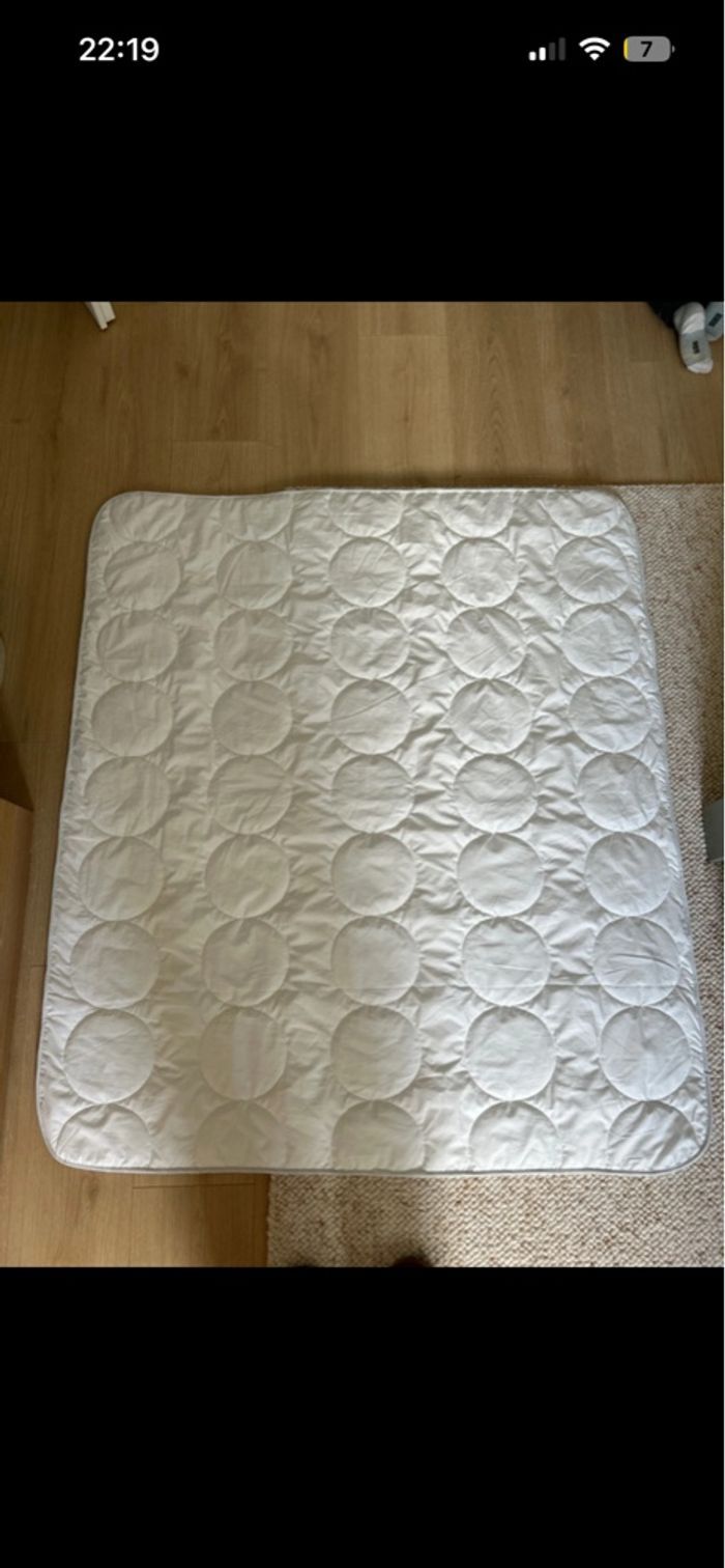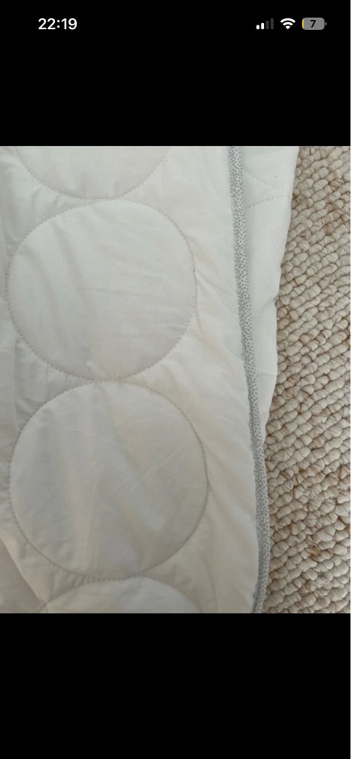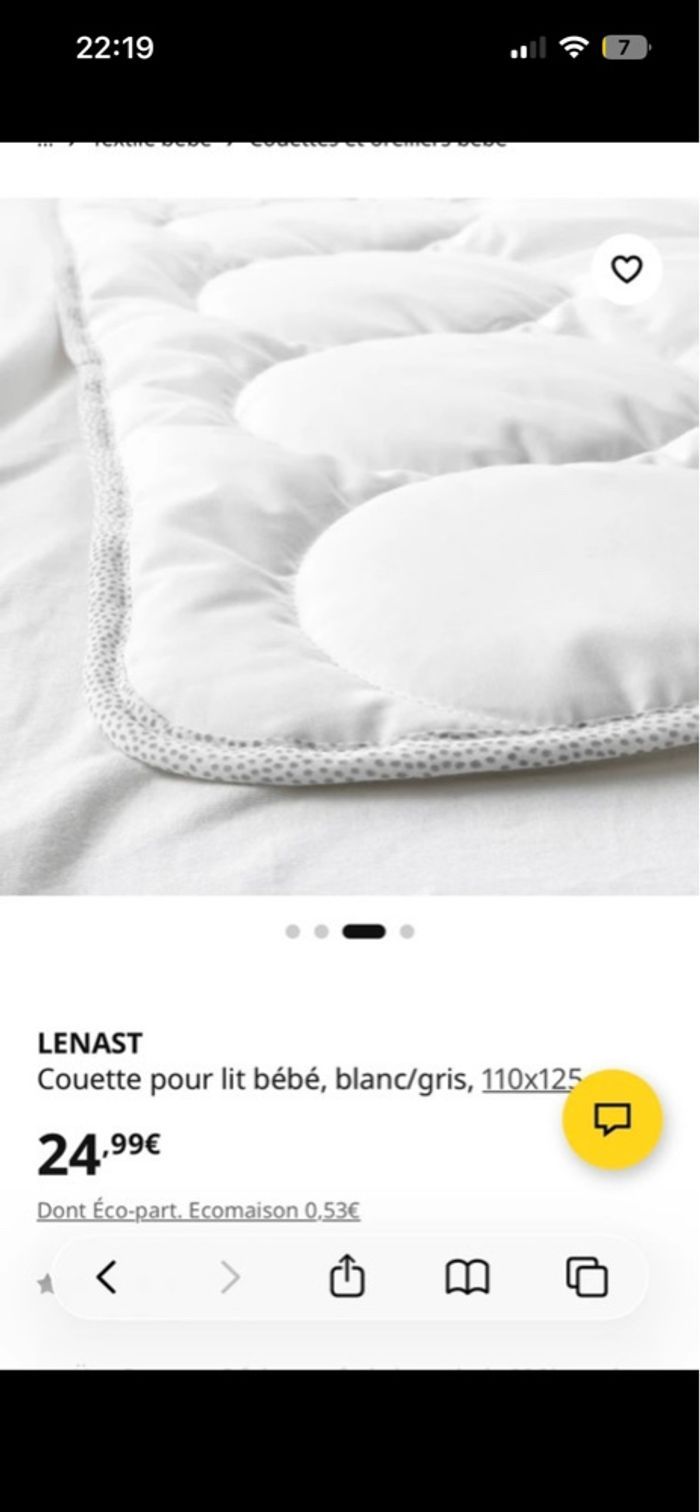 Couette pour bébé l’intermédiaire entre la gigoteuse et une vrai couette de 90x200. Elle est neuve je l’ai acheté à IKEA mais cela ne va pas. Mon fils est trop grand il a 3 ans. Prix neuf : 24,99 euros en magasin