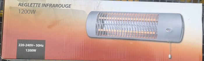 Je vends cette réglette infrarouge de 1200W. - Type de produit : Réglette infrarouge - Puissance : 1200W - Fixation murale orientable - Indice de protection IP24, installation possible en salle de bain - Coloris : Gris aluminium - Dimensions : L 56 x P 12 x H 16,3 cm - Poids net : 1,3 kg État neuf. N'hésitez pas à me contacter pour plus d'informations.
