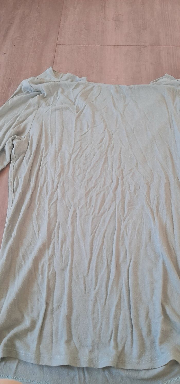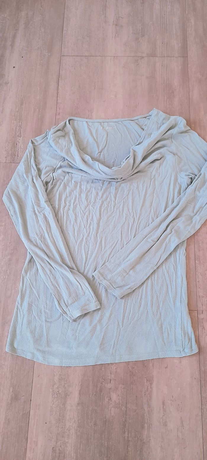 Vert pâle, en matière fluide en viscose et elastane. Col roulé retombant. Très peu porté, en très bon état. Taille M in extenso