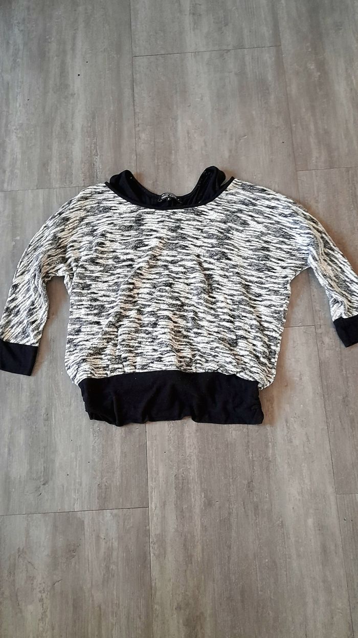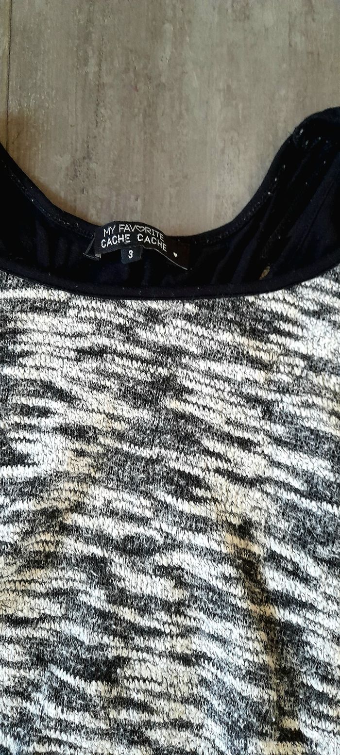 Neuf. Pull fin noir et blanc avec debardeur noir intégré. Manches 3/4, effet boule à la base, col rond dégagé. Taille 3 équivalent à un 40.