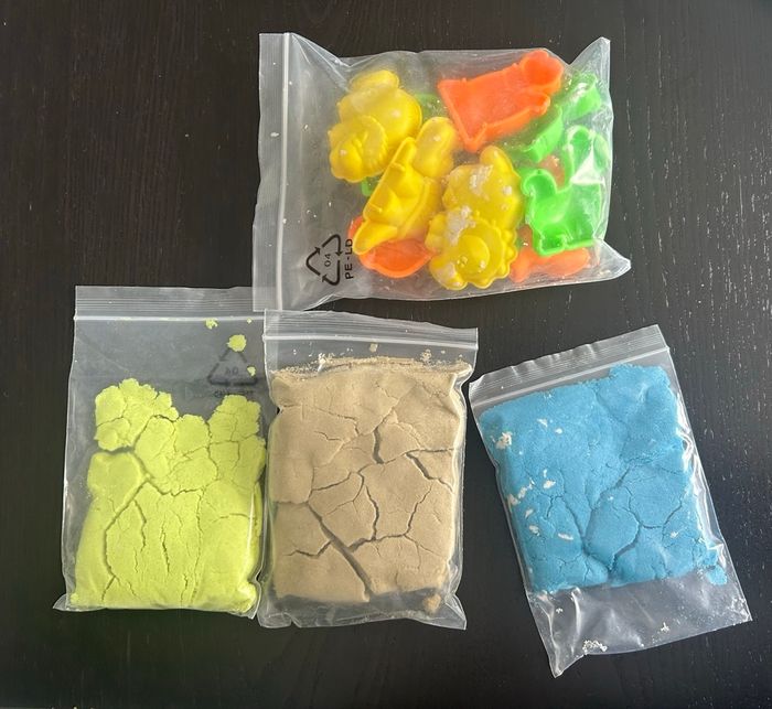 Lot contenant : - 3 sachet de sable magique de couleur bleu, marron et vert/jaune - 1 sachet de 10 moules dinosaures Provenant de chez picwictoys