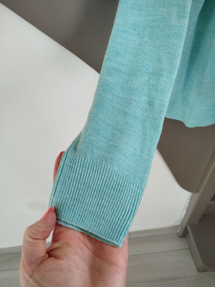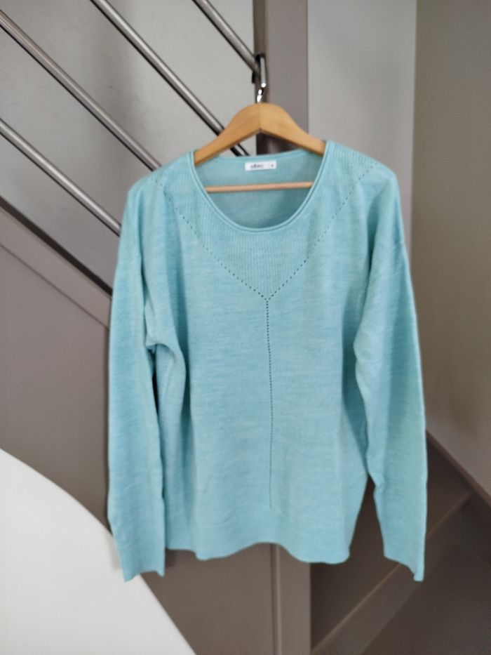 Pull vert menthe à col rond, détails ajourés à l'avant. Porté une seule fois. Marque Gémo, taille M. Réduction activée sur les lots. #femme #pull #gemo #taillem #taille38