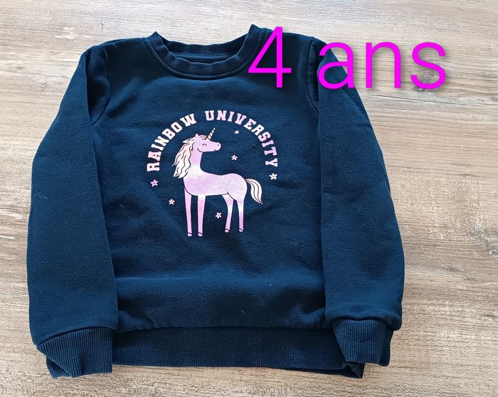 Sweat bleu marine avec licorne, taille 4 ans, de marque Kiabi, très bon état. Possibilité de faire des lots