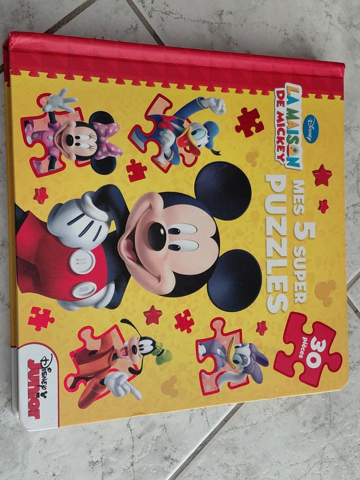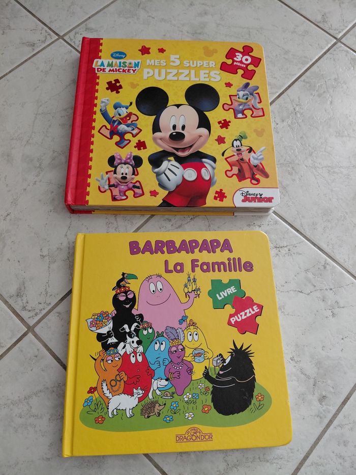 2 livres puzzles: 1 avec Mickey et ses amis (5 puzzles se 30 pièces) 1 avec Barbapapa et sa famille (5 puzzles de 12 pièces)