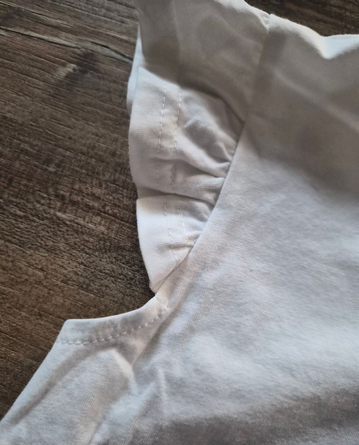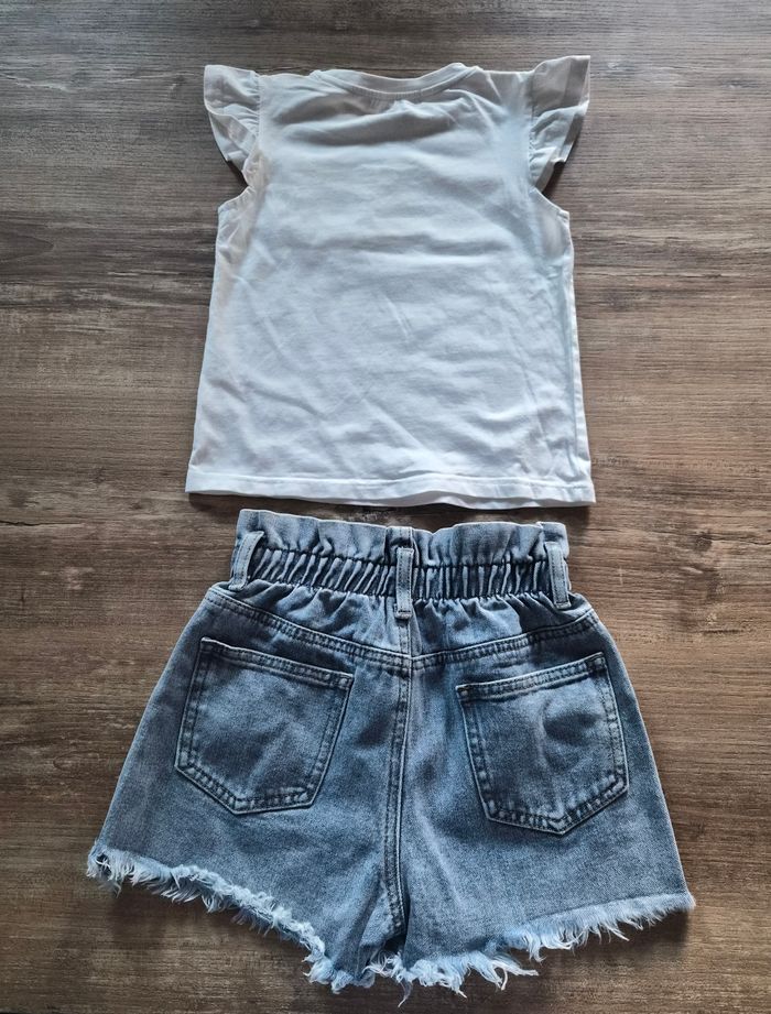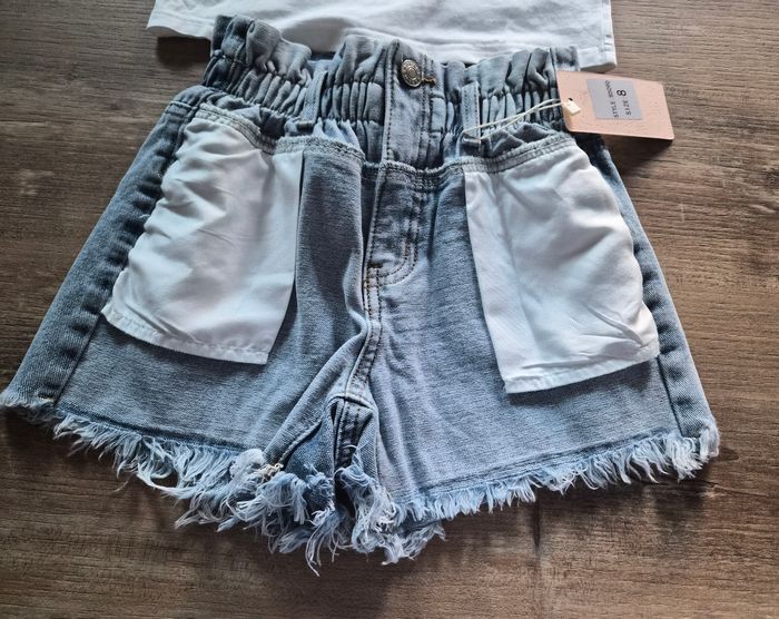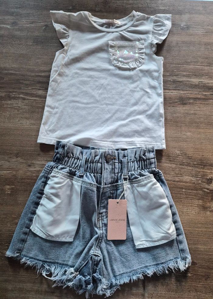 Joli ensemble composé d'un short en jean taille élastiquée effet fausses poches jamais porté encore étiqueté et top avec volants et sequins en bon état #fille8anstattoogirl_3