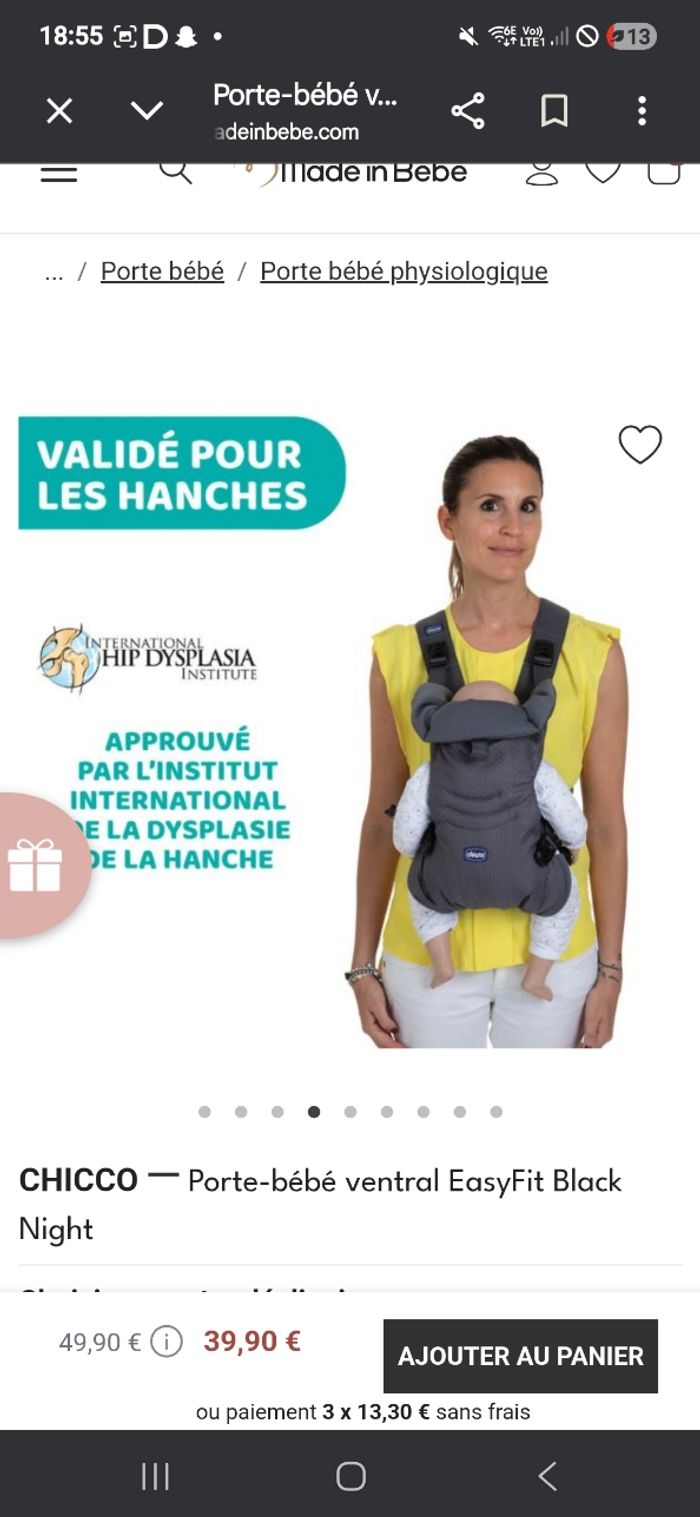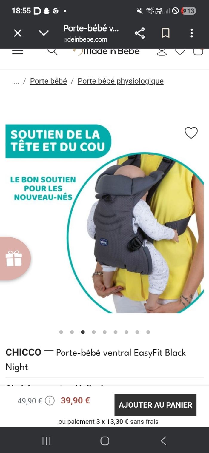 Porté bébé ventral Easyfit Black night Facile à mettre et à ajuster, il s'adapte parfaitement aux parents et à l'enfant. Vous pouvez mettre bébé face à vous ou face à la route pour qu'il découvre les paysages qui l'entourent. L'assise large du porte-bébé Chicco assure une position adaptée pour les hanches de bébé. Vous pouvez également replier la partie supérieure du porte-bébé pour donner un support supplémentaire à la tête et à la nuque de votre petit bout. Servit quelques fois Dès la naissance jusqu'à 9kg Achat neuf : 49.90 €