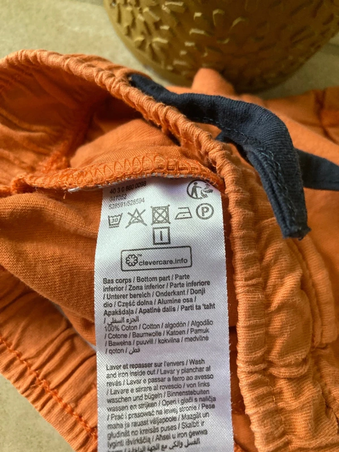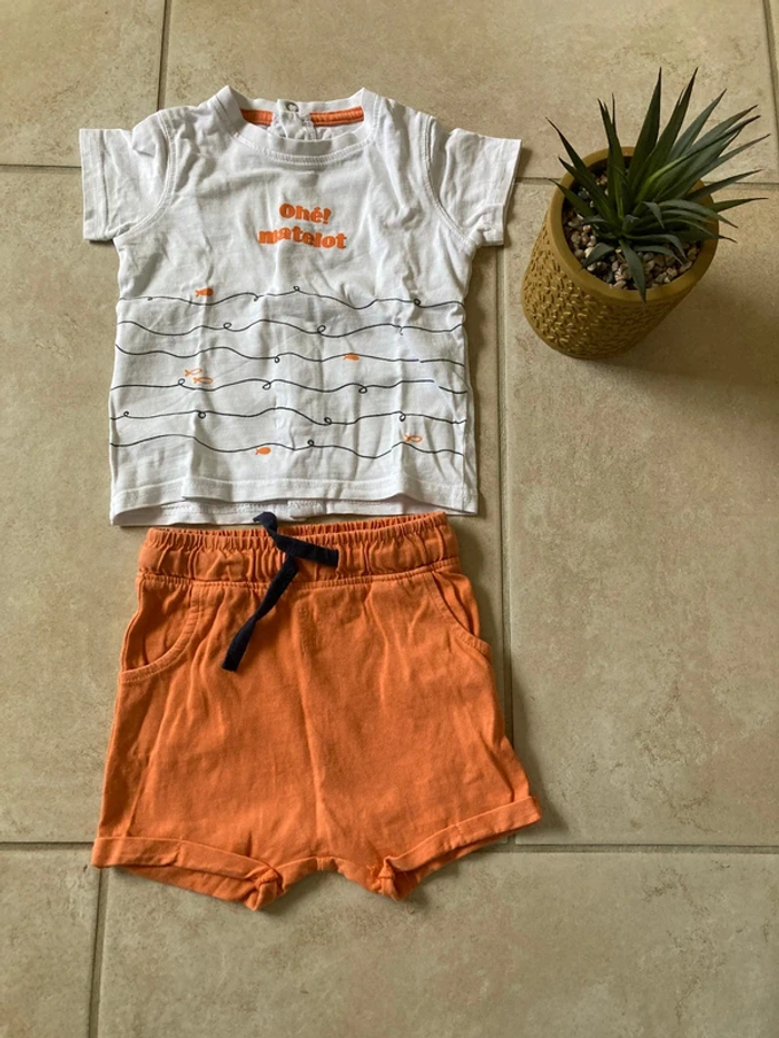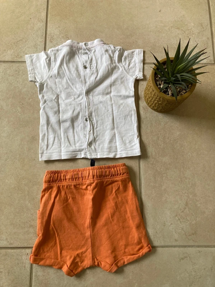 👦 Ensemble garçon composé d’un t-shirt manches courtes avec boutons pression dans le dos et d’un short avec taille élastique et lien de serrage, couleur blanc et orange 👦 Taille 6 mois 👦 Marque Gémo 👦 Composition coton et élasthanne 👦 Très bon état 👦 Maison non-fumeur 👦 Réduction sur les lots et envoi rapide