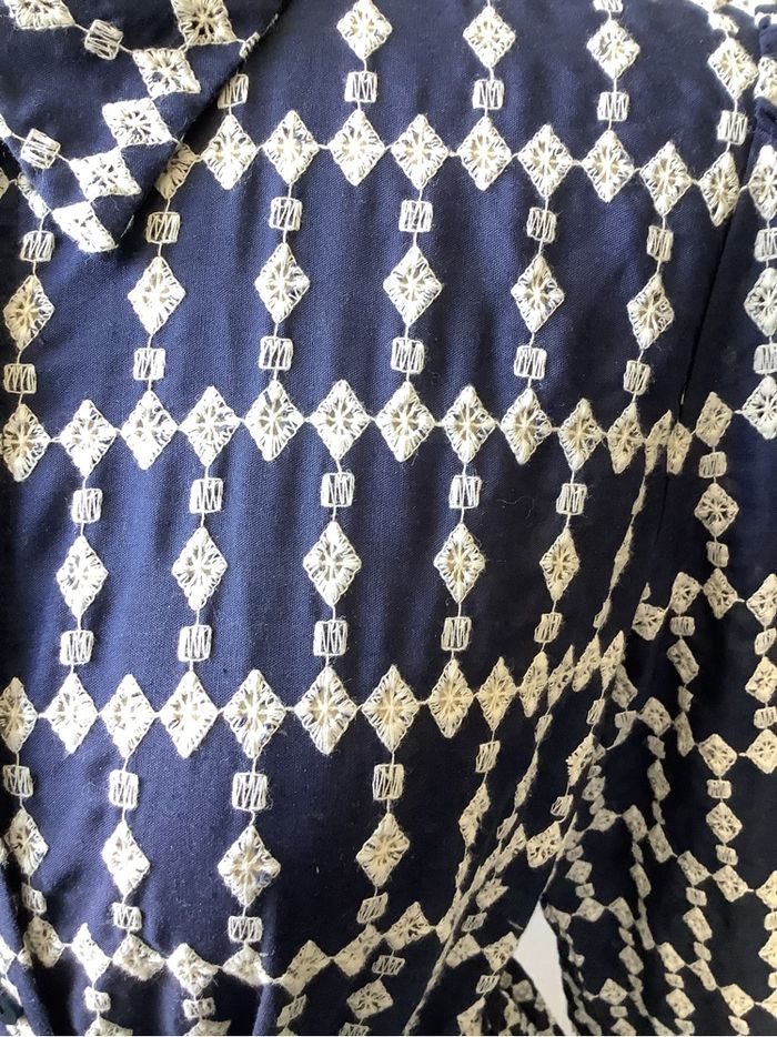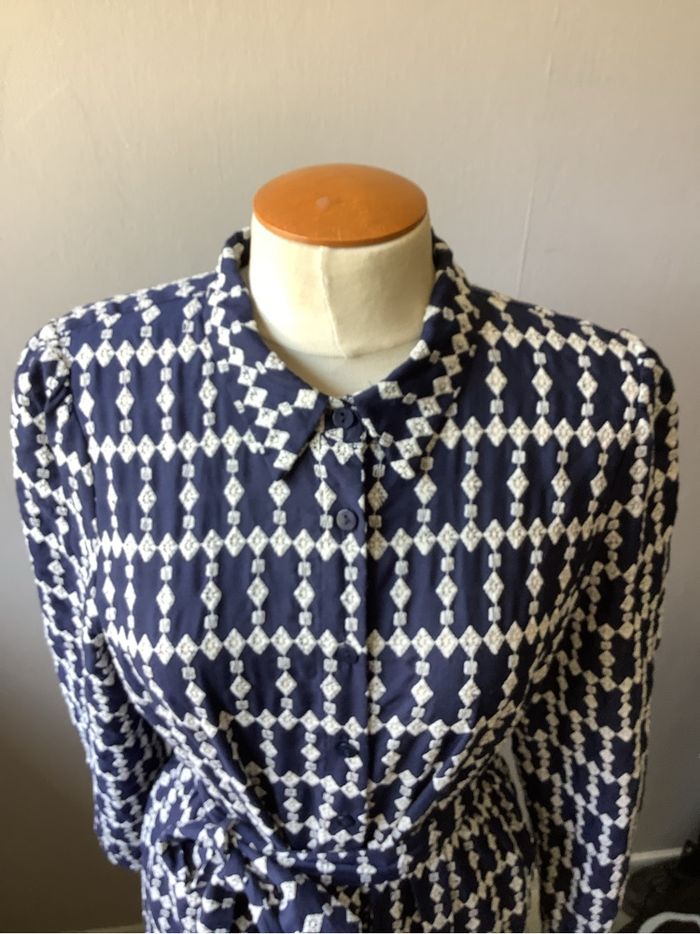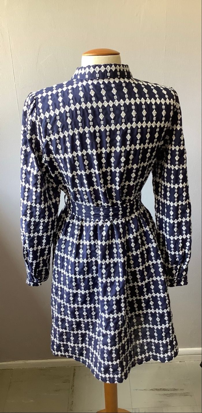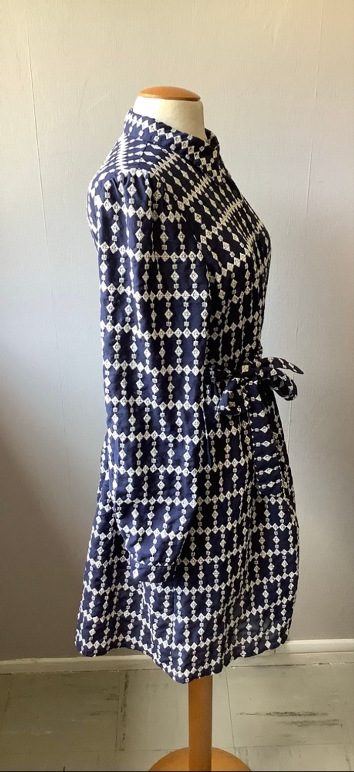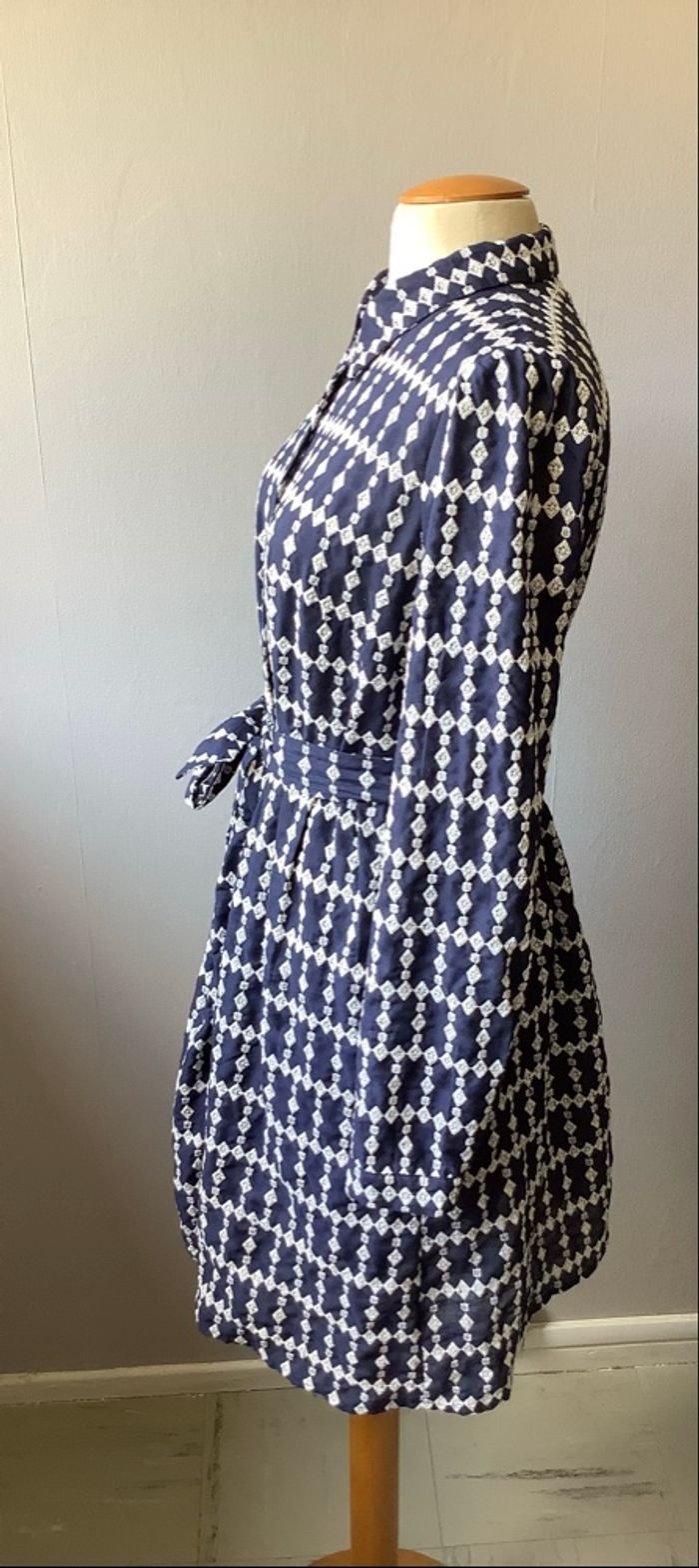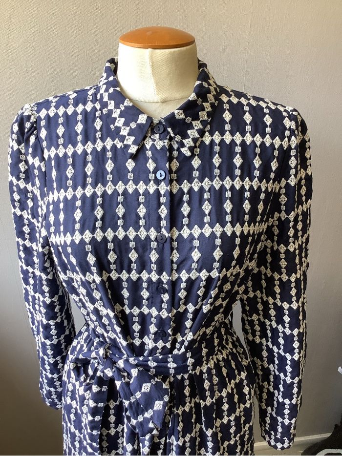 Très belle robe Majolica De couleur bleu marine et broderie blanche Taille L Toute boutonnée sur le devant Ceinture assortie Vraiment très chic et élégante Très bon état