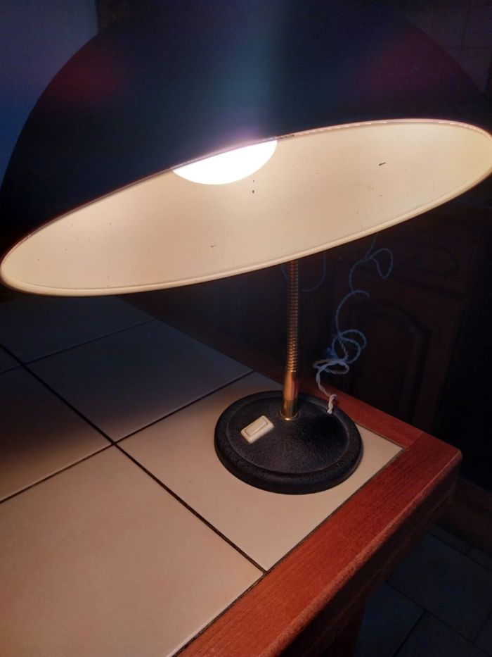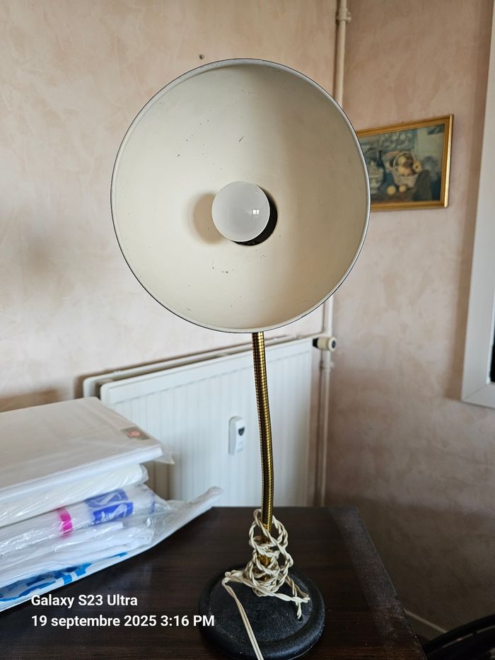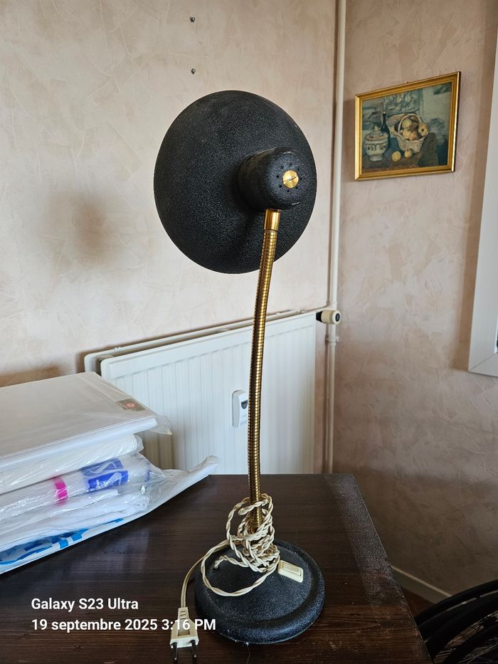 Lampe de bureau vintage années 1950 🖤 • Hauteur maximale : 55 cm • Hauteur de travail idéale : 39 cm ou plus • Diamètre abat-jour : 20 cm • Poids : environ 1,8 – 1,9 kg (socle lourd et stable) • Col de cygne orientable • Interrupteur à bascule plat (pas bouton “clic-clac”) • Métal noir martelé & finition dorée • Intérieur blanc pour une belle diffusion de lumière Fonctionne parfaitement. Très jolie pièce pour déco bureau, atelier ou ambiance rétro industrielle ✨ Belle patine liée à l’âge. Envoi soigné 📦 ou remise en main propre sur Raimbeaucourt (59) #vintage #lampe #lampevintage #lampedechevet #lampedebureau