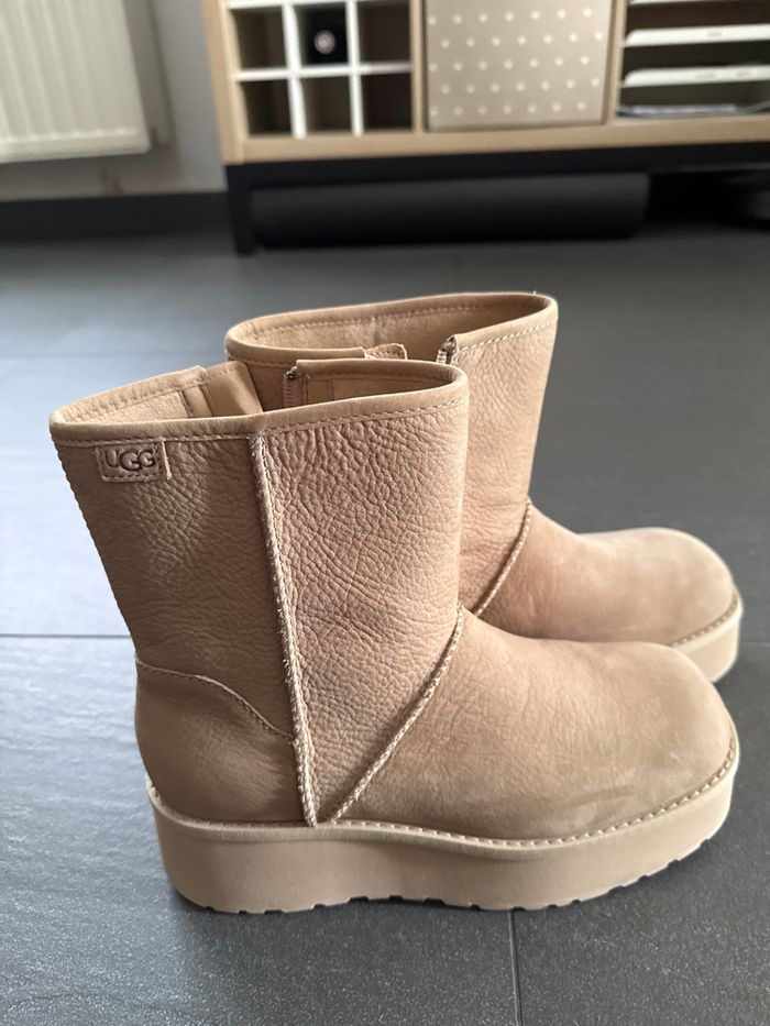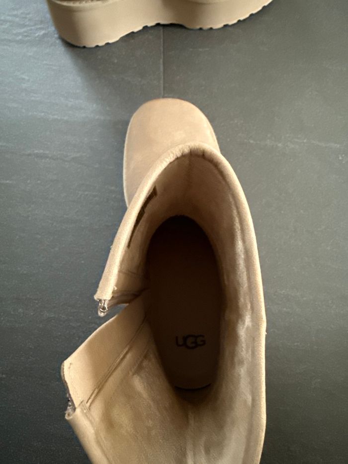 Jamais porté Protection : matières imperméables ou résistantes à l’eau Cuir résistant à l’eau Fermeture éclair au milieu Doublure en microfibre, doublure en tissu (51 % UNIFI RPET, 49 % polyester) Semelle de propreté avec traitement anti-odeurs à base de menthe poivrée Assise plantaire moulée en EVA Semelle intermédiaire en EVA issu de la canne à sucre Semelle extérieure en caoutchouc durable Hauteur de la tige : 16,5 cm Plateforme en EVA de 3,8 cm Hauteur de talon : 5 cm Trépointe synthétique Logo UGG® estampé à chaud Modèle idéal pour : un style décontracté
