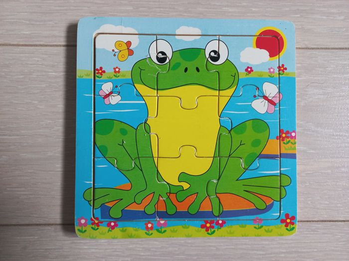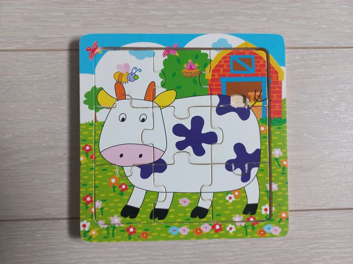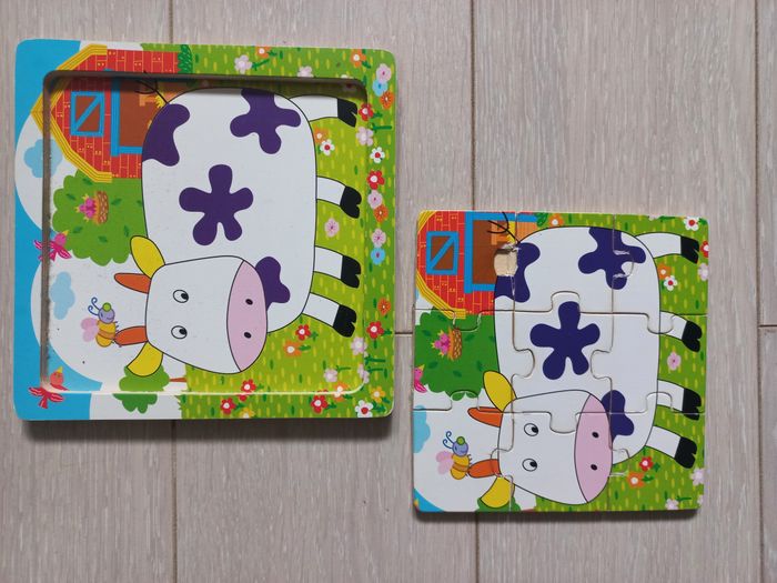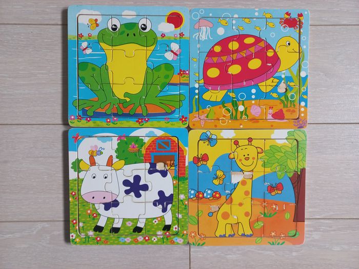 4 petits puzzles de 9 pièces chacun. Le cadre et les pièces sont en bois. Des heures de jeu et d'apprentissage pour les tout-petits ! Quelques défauts sur certains, visibles sur les photos
