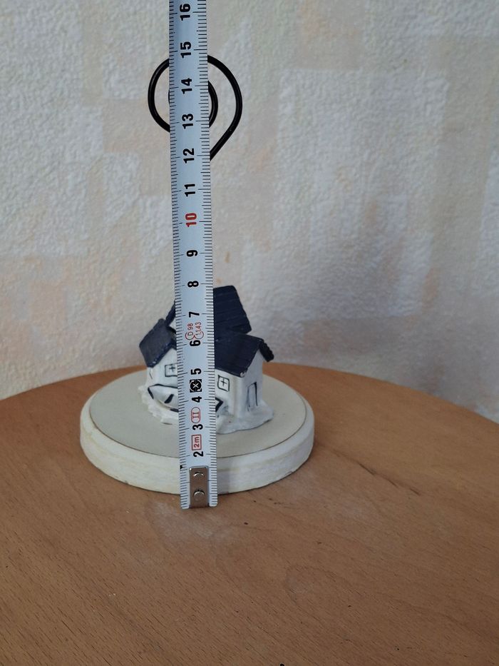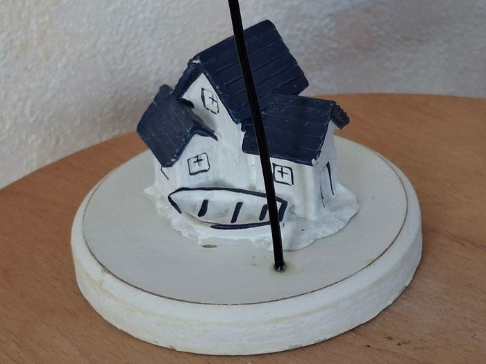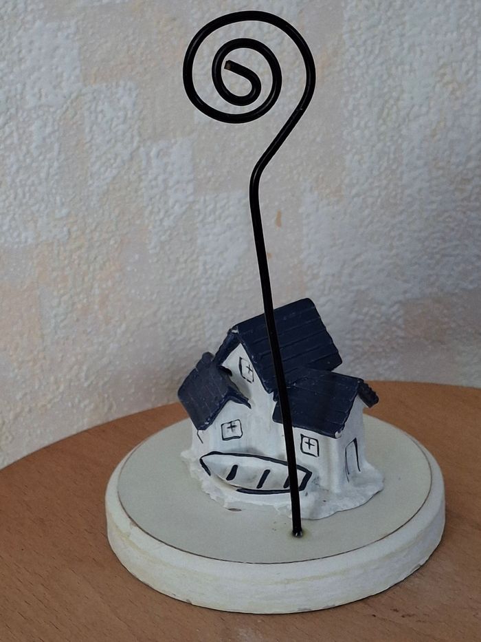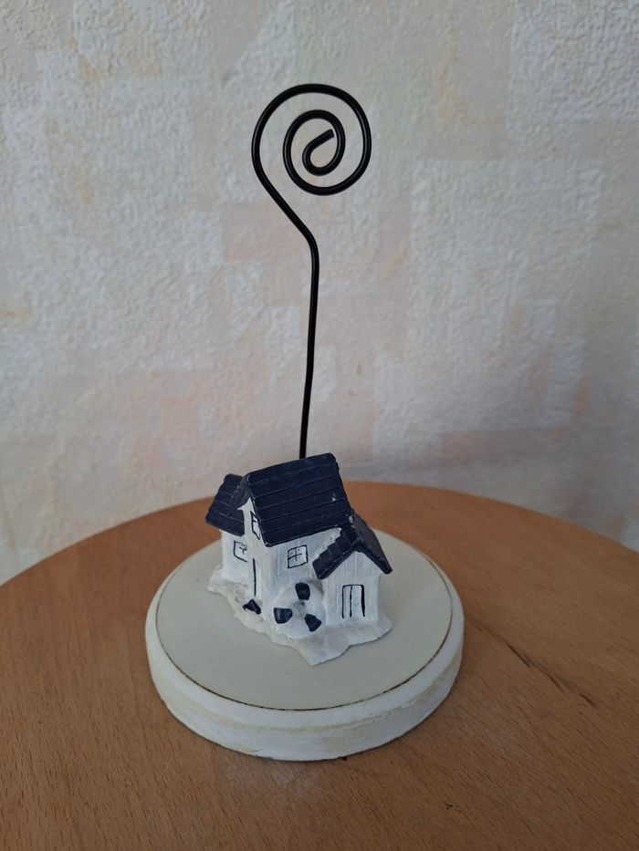 Vends porte photo, avec une tige au bout en spirale pour tenir la photo. En support socle en bois avec dessus une petite maison et dans barque. Couleur blanc et bleu. En très bon état, Dimensions du socle environ 9cm. Hauteur environ 15cm