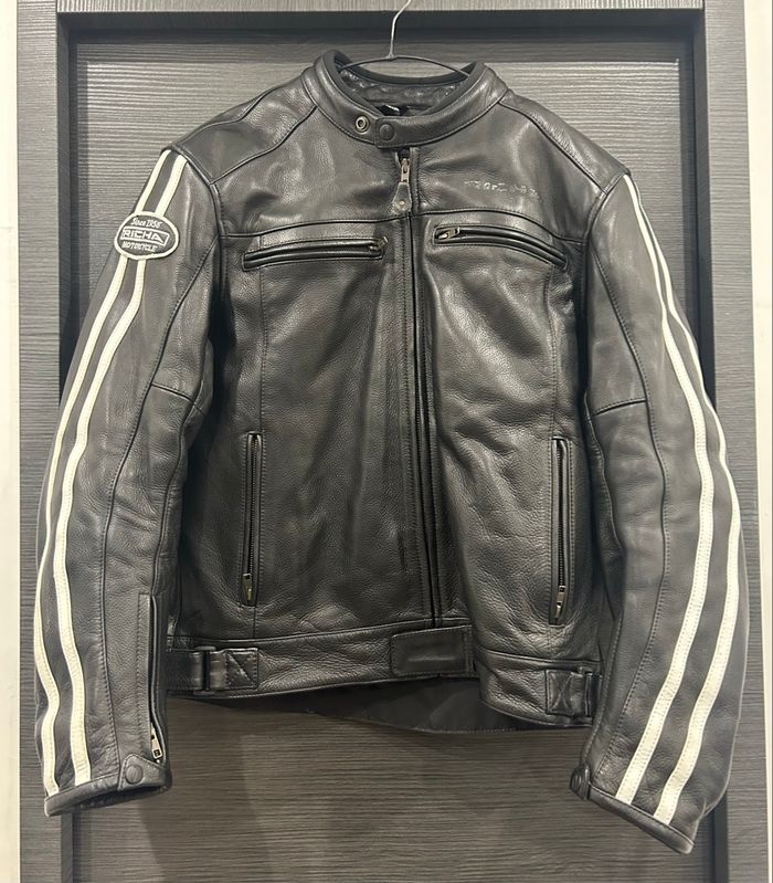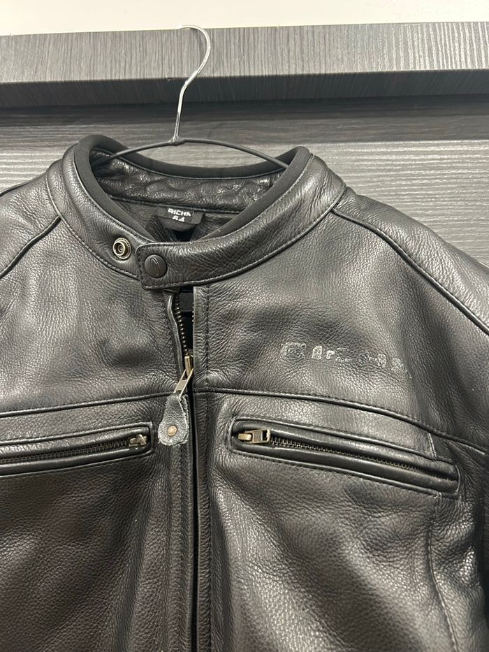 Veste moto cuir homme Richa Ventilation et doublure thermique Doublure thermique amovible Réglable sur les hanches Deux poches extérieures avec zip Deux poches avec zip Poche téléphone et porte-monnaie Confort Préparé CE approuvé Plastron Veste comme neuve Taille 54