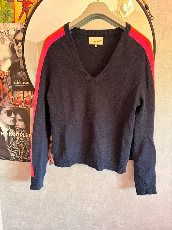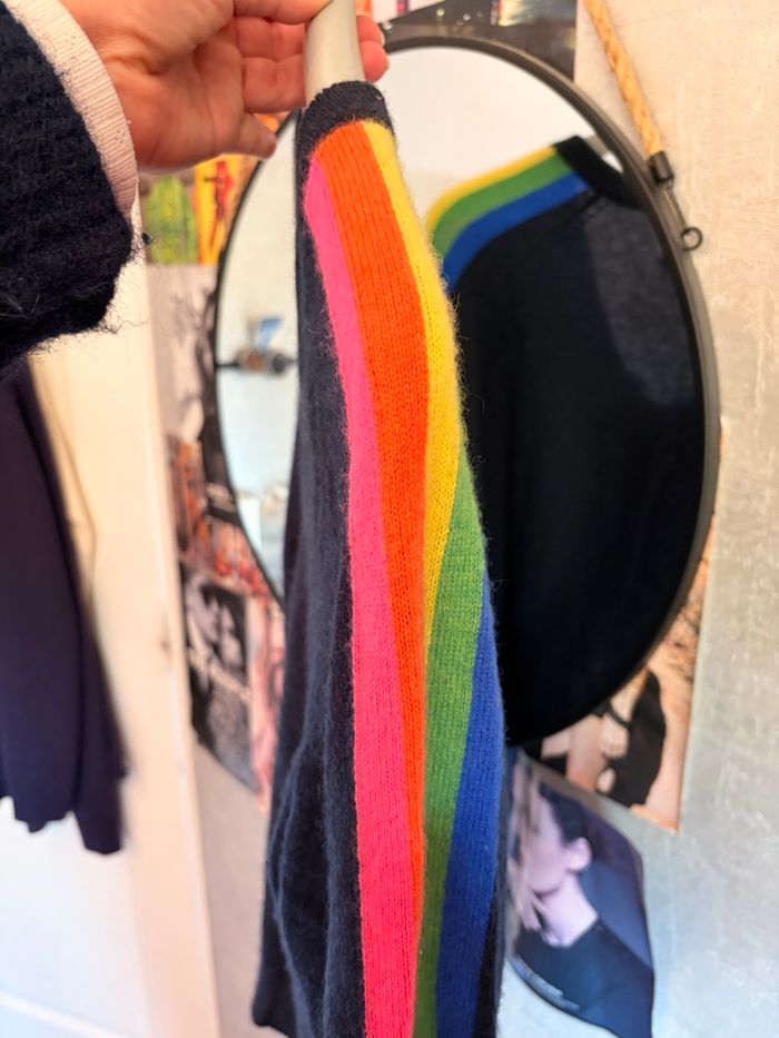 Très joli pull bleu Marine Les bandes de couleur le rend vraiment moderne en plus d’être bien chaud ! Valeur 99 euros