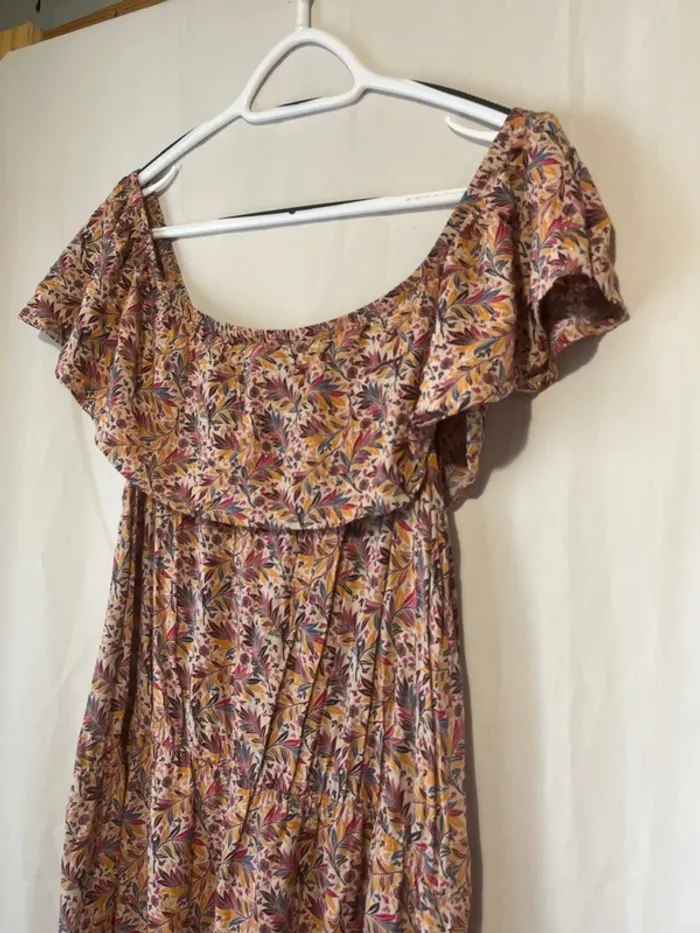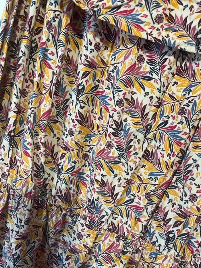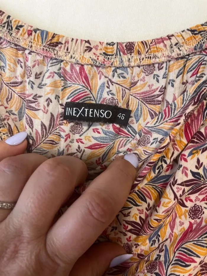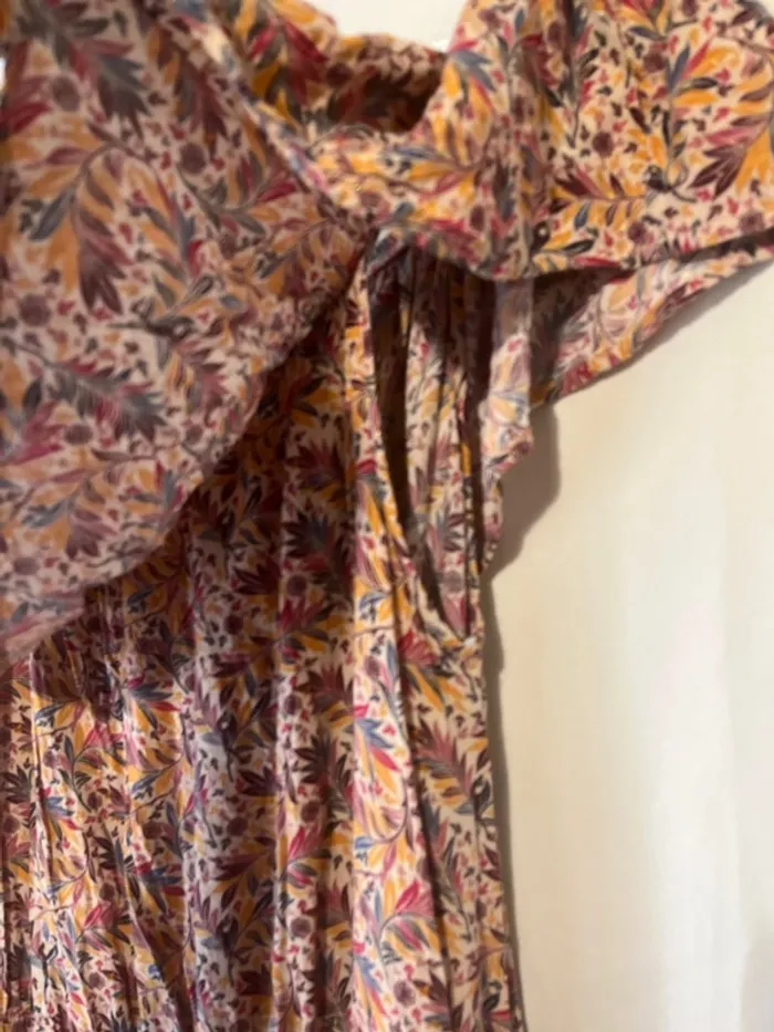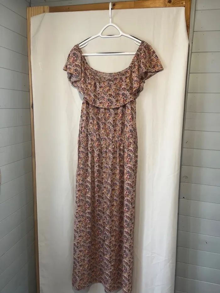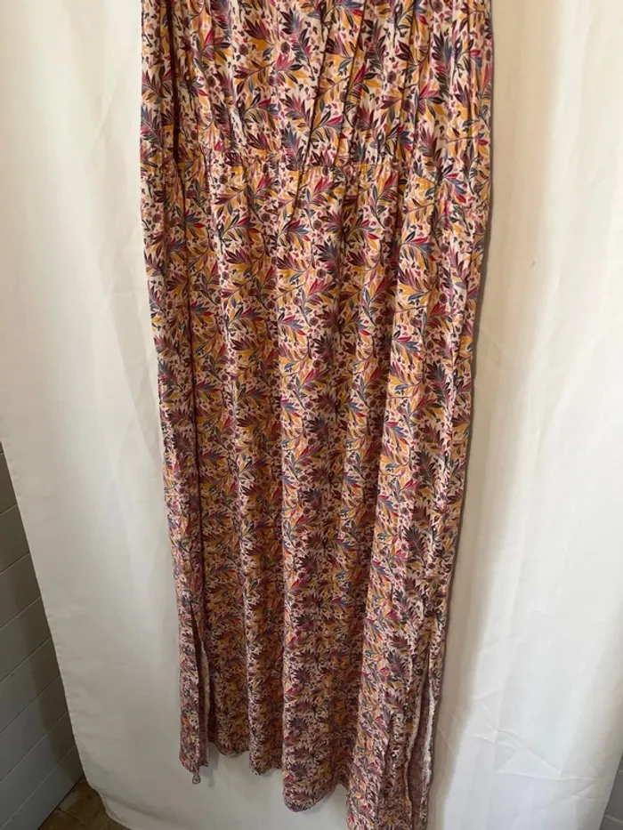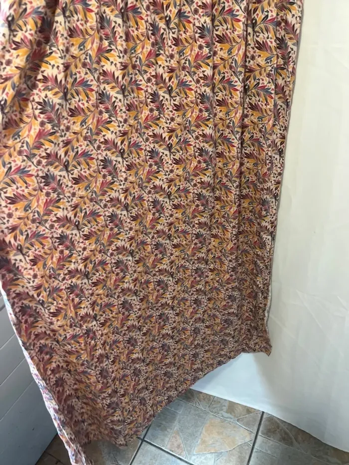 Robe longue Imprimée fleurs Taille 46 Ligne doré brillante Aisselle à aisselle 53 cm, Longueur 145 cm