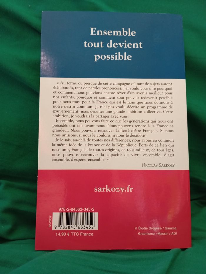 Je vends le livre "Ensemble" de Nicolas Sarkozy, un ouvrage politique qui intéressera les lecteurs passionnés par la vie publique française. - Titre : Ensemble - Auteur : Nicolas Sarkozy - Éditeur : XO Éditions - Format : Broché - Langue : Français - ISBN : 978-2-84563-345-2 Bon état N'hésitez pas à me contacter pour plus d'informations ou pour convenir d'un rendez-vous.