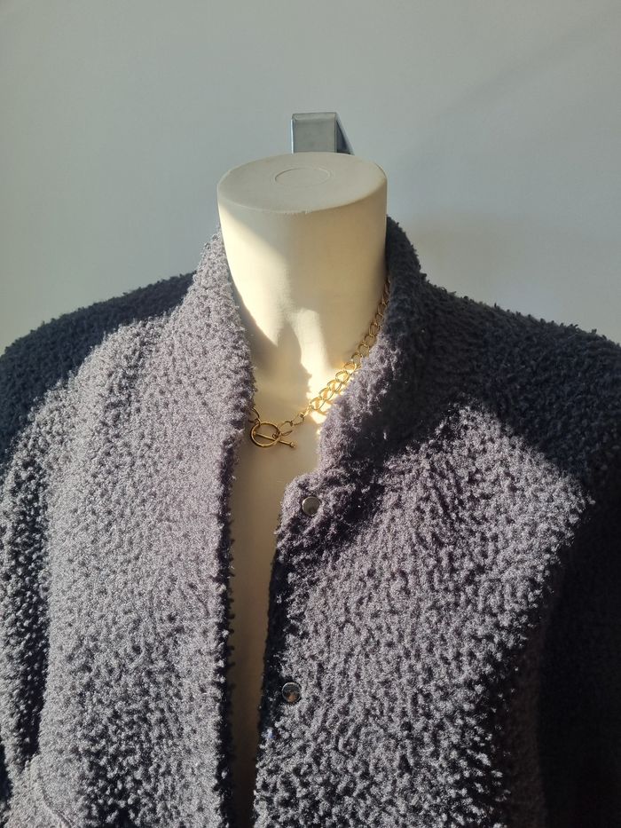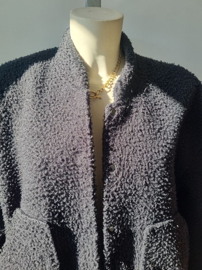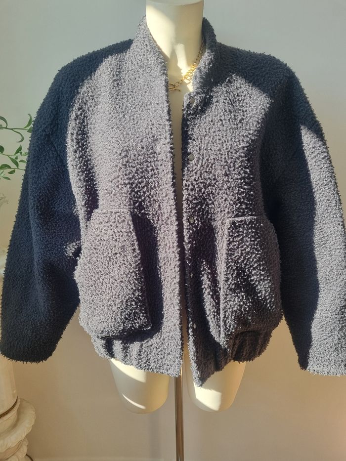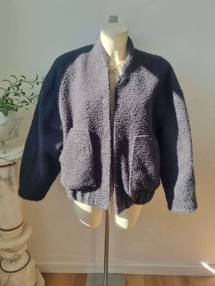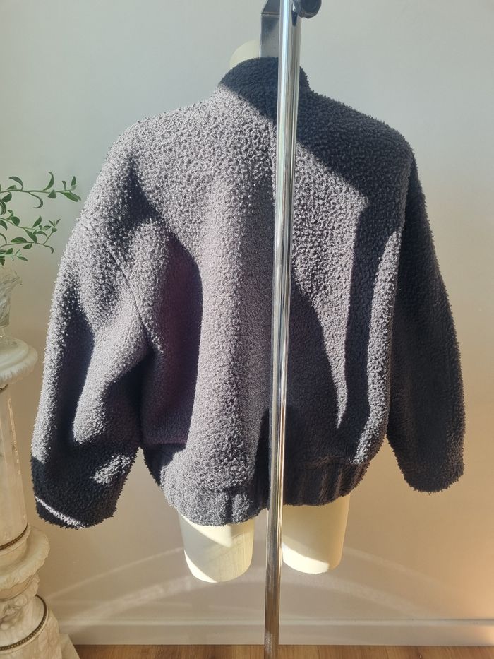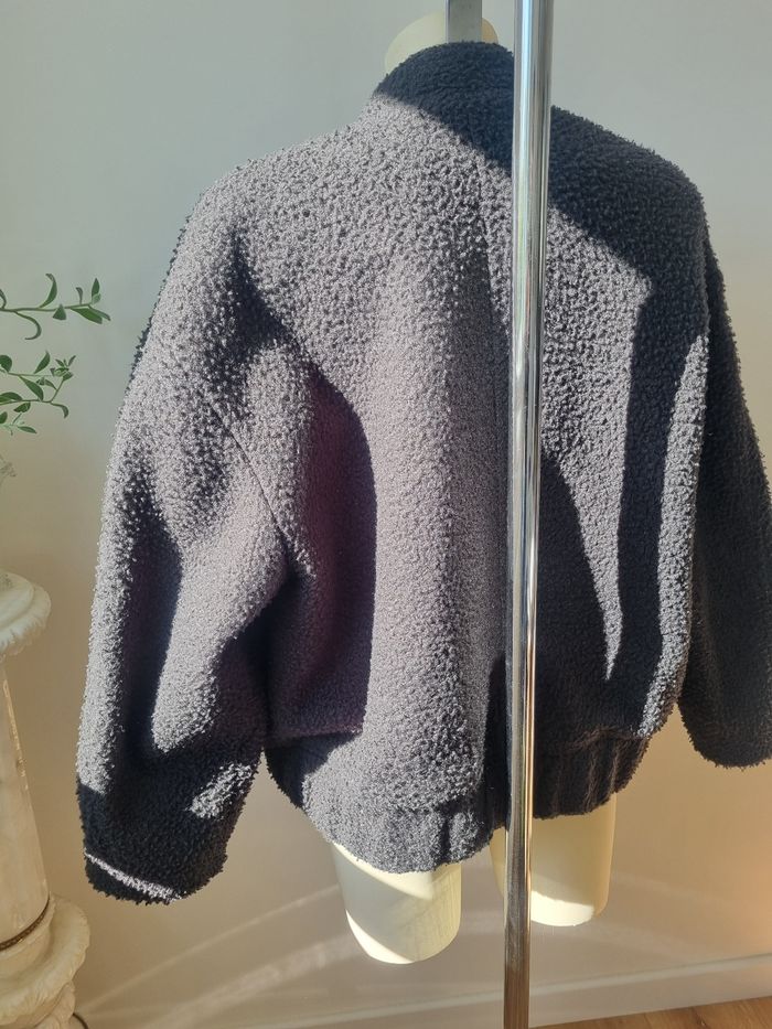 Magnifique manteaux bouclette noir, gris anthracite De la marque Mango Coupe bomber, teddy Oversize Collection de l'année dernière En trés bon état Resséré aux manches et à la taille Boutons à pression Deux poches Taille S Dimensions fermé : - Largeur épaules : 63 cm - Longueur dos : 70 cm - Largeur aiselles : 60 cm