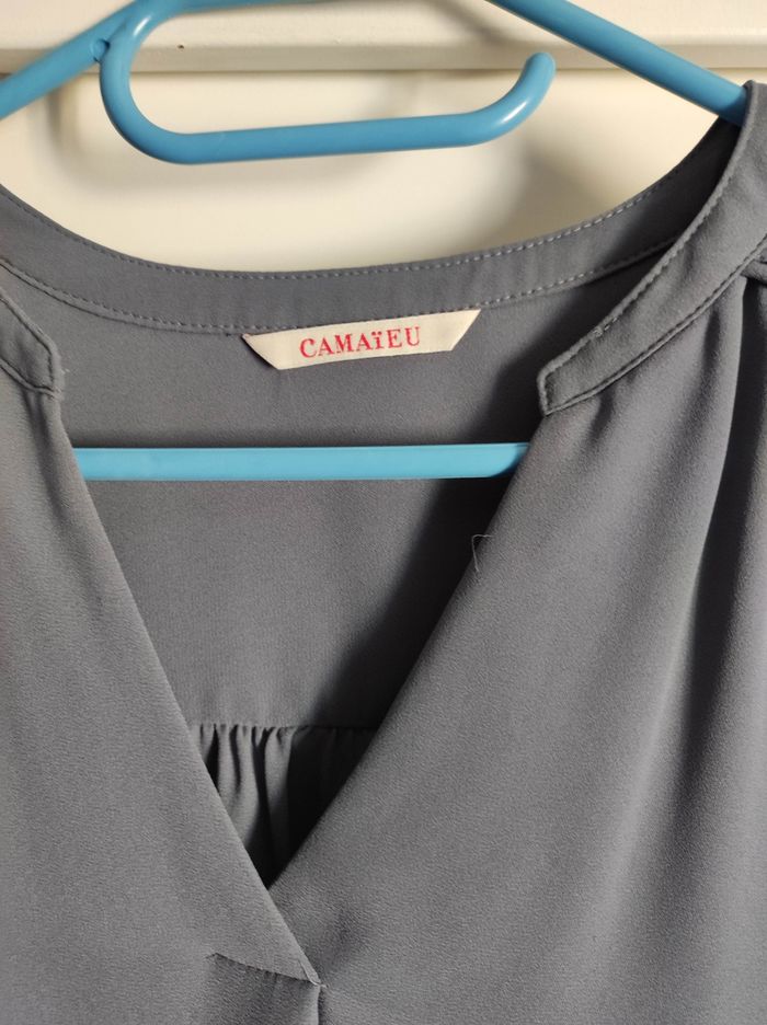 Matière très légère et un peu transparente. Étiquette coupée, c'est un XS mais Camaïeu taille grand et peut convenir à un petit S. C'est un bleu qui tire vers le gris. #XS34femme_ameli72540 #S36femme_ameli72540