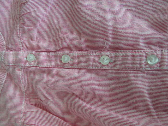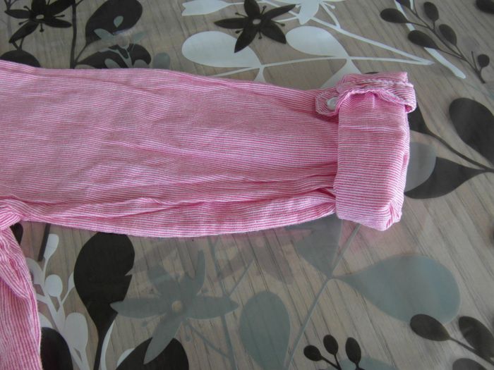 tissus léger mais peut se porter au dessus d'un maillot ou avec un gilet avec ceinture; rose à rayures blanches manches longues mais peuvent se remonter avec patte (photo3) très bon état GEMO