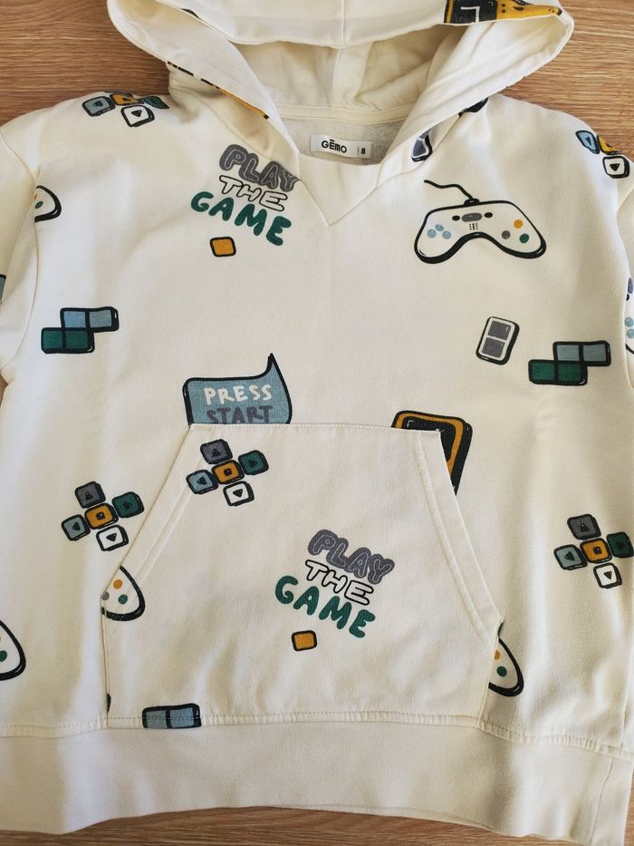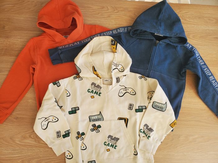 Lot de 3 pulls et veste sweat, légers pour la mi saison. Taille : 8 ans Marque : gemo Sur le orange il y a 2 légères traces de feutre (discret), voir