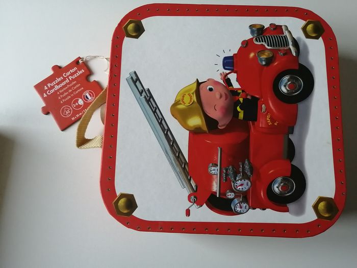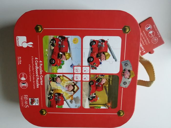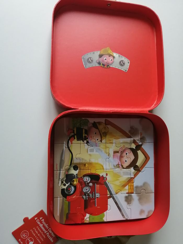 puzzle les pompiers janod 4 puzzles de 6, 9, 12 et 16 pièces rangé dans une valise en carton transportable à partir de 3 ans peut présenter des traces du jeu