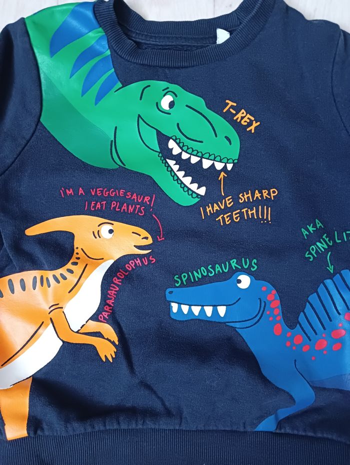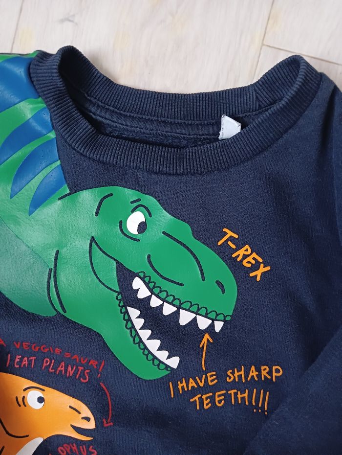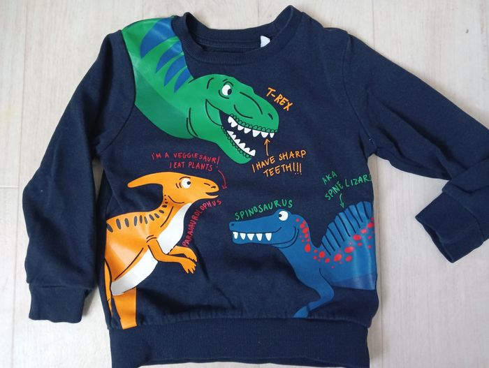 🌀 Sweat garçon thème Dinosaures C&A🌀 - Description : 🔺Il y a un accro sur une manche ( voir photo entourée) autrement tout le reste en très bon état. ▪️Taille 5 ans (110cm) ▪️Col rond ▪️80% coton et 20% polyester ✨ Flocages des dinosaures en parfait état, jamais passé au sèche linge.