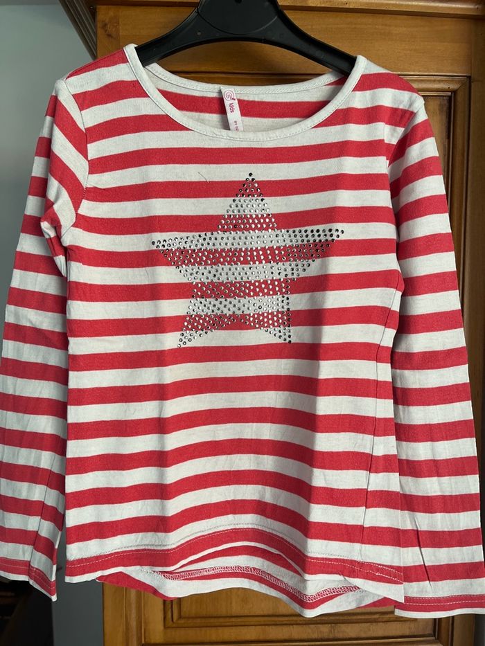 T-shirt d’été, manches longues, rayé blanc et rouge Étoile sur le devant , certains strass ont noirci