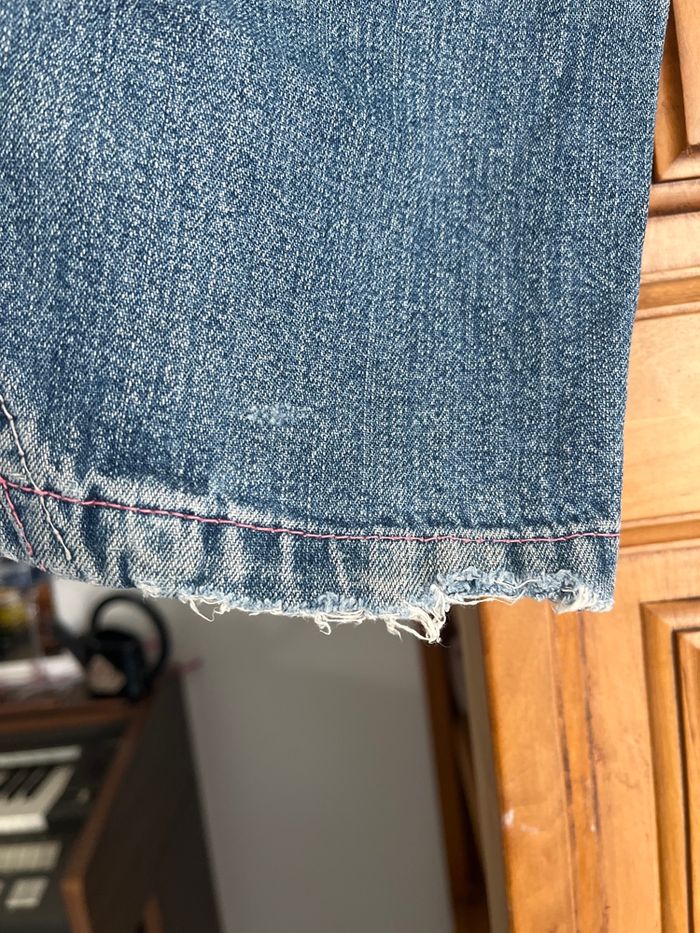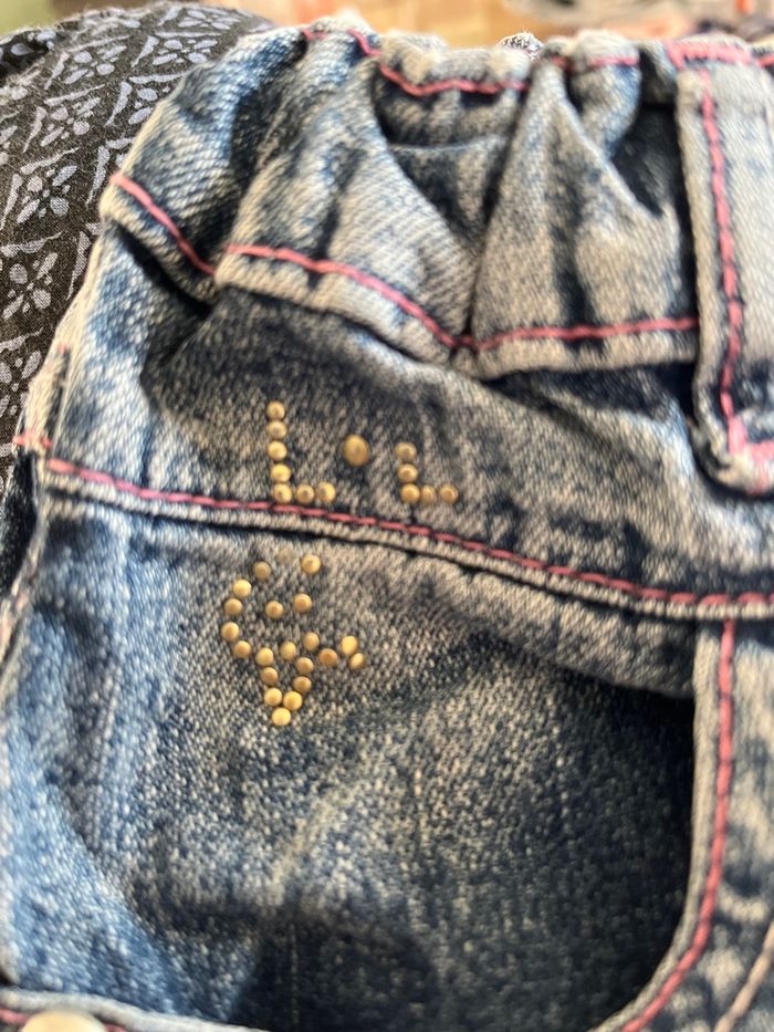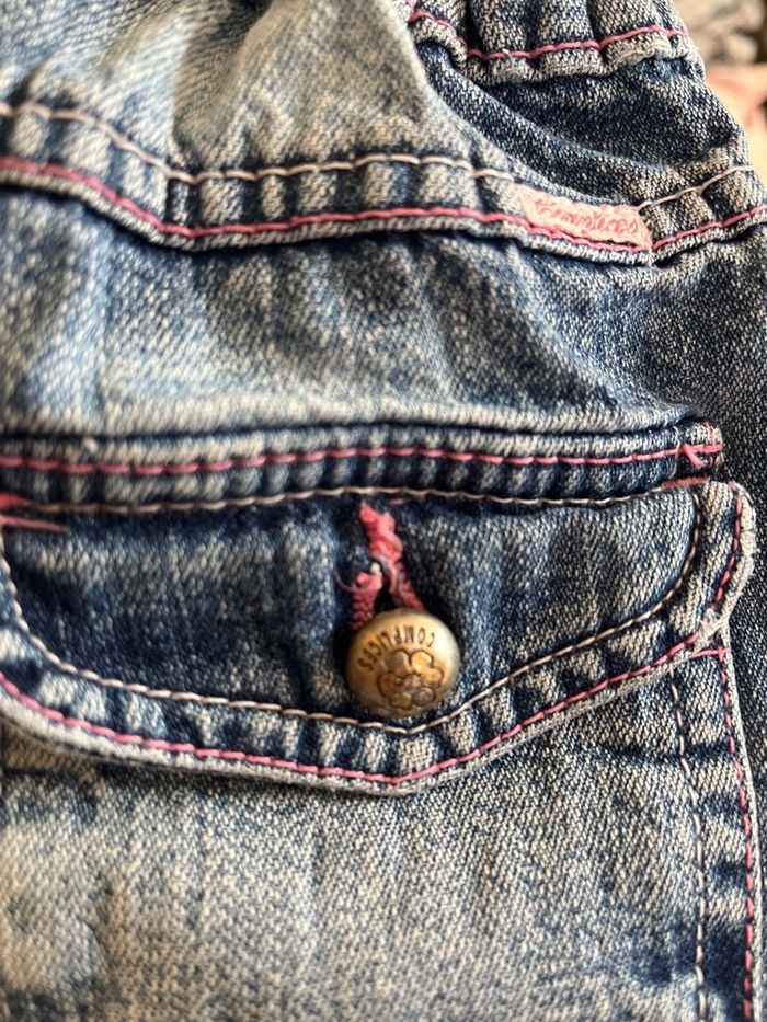 Jean coupe droite Ourlet un peu abimé derrière jambe gauche Fleurs crochetées fantaisie sur les poches avant Et strass Boutons fantaisie sur poches arrières Toutes les coutures sont roses
