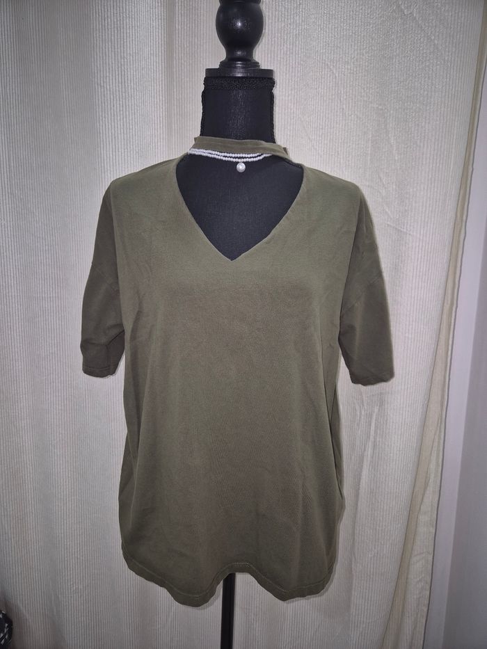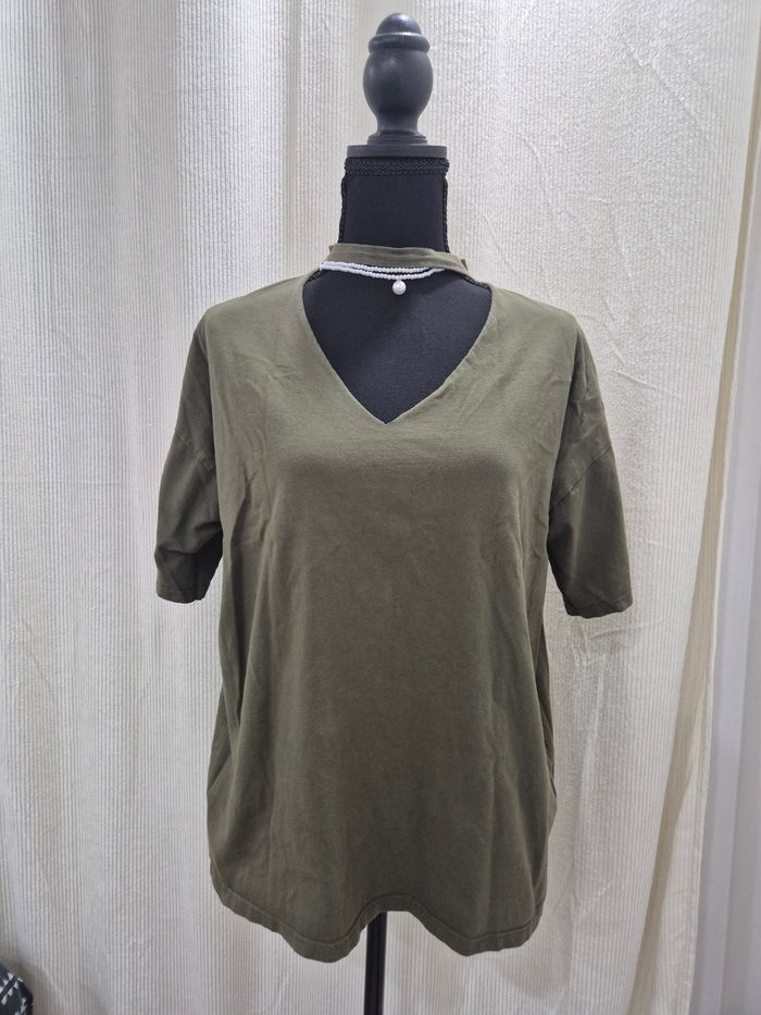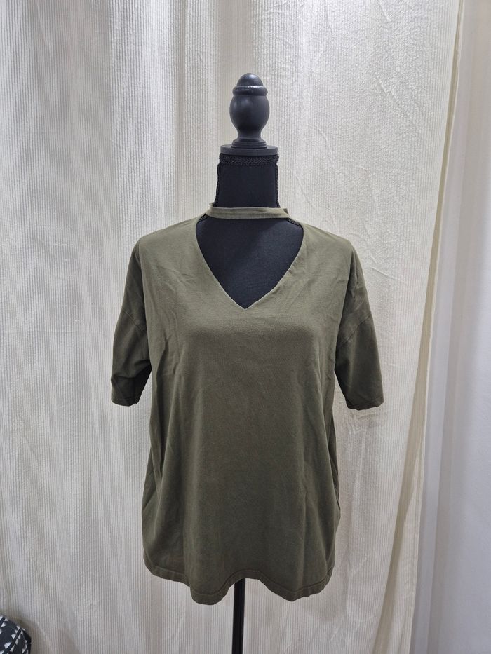 ▪︎Tee-shirt Pull&Bear, ▪︎Taille S, coupe légèrement loose ▪︎Très bon état. - couleur kaki olive - col V plongeant avec col collier stylé - manches courtes - idéal casual ou layering