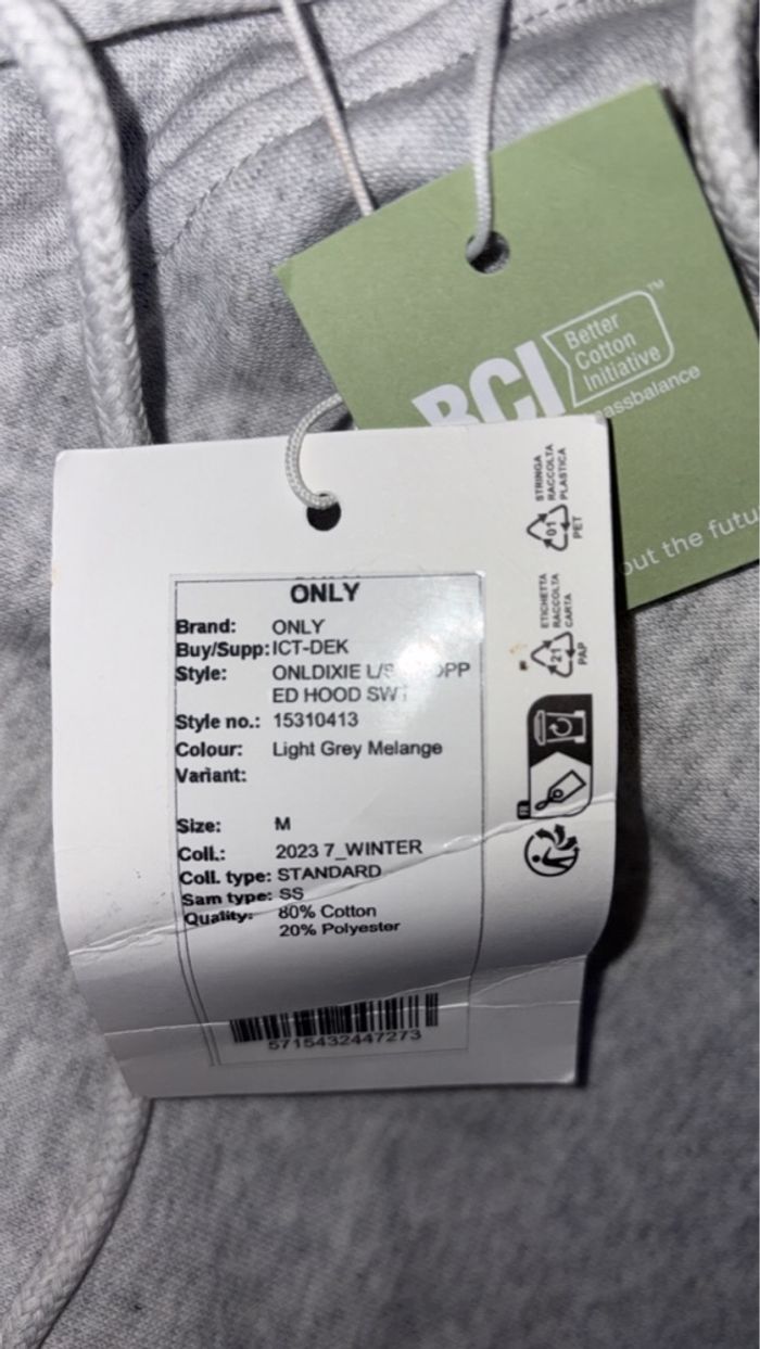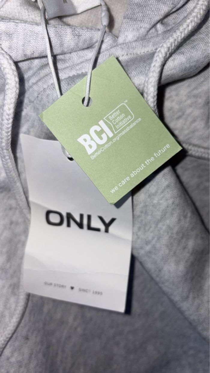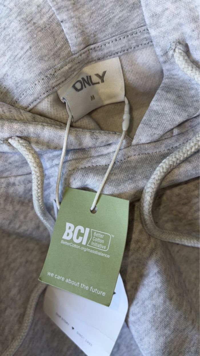 Je vends ce **sweat à capuche court de la marque ONLY**, acheté il y a quelques mois. * **Pourquoi je m'en sépare :** Je fais un grand tri dans mon dressing et je ne l'ai finalement jamais porté, il ne correspond plus à mon style actuel. * **État : Neuf avec étiquette.** L'article est impeccable, jamais porté ni lavé. (Voir photos des étiquettes d'origine). * **Coupe/Taille :** Taille M. La coupe est de type "Cropped" (courte), parfaite avec un pantalon taille haute. Il taille normalement pour un M. * **Matière :** 80% Coton / 20% Polyester (Label BCI - Better Cotton Initiative).
