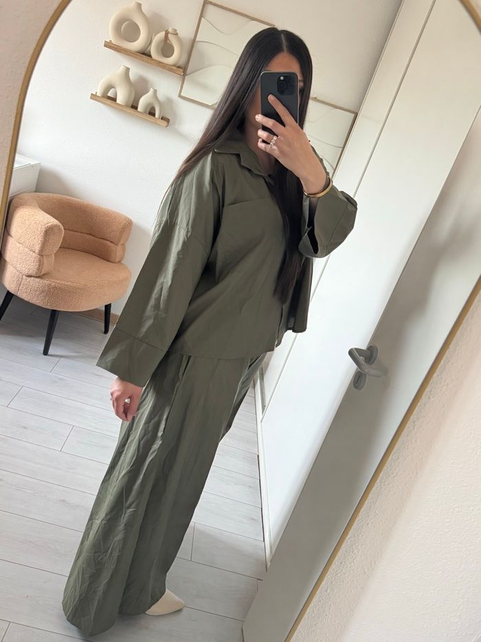 Ensemble chemise avec pantalon 100 % coton Idéal pour les filles qui font 1,65 m le pantalon est très large pour les filles quu taille 1,62 je vous conseille de mettre avec les talons
