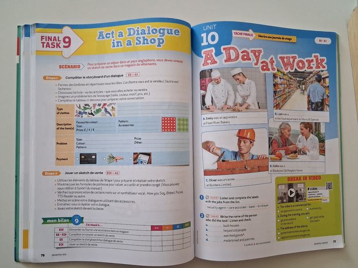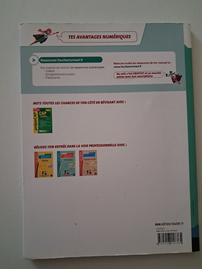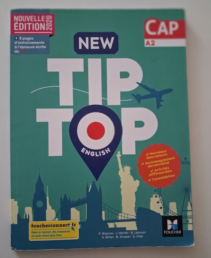 Manuel d'exercices d'Anglais pour CAP A2, édition 2020. Il y a 128 pages. Cinq pages avaient été faites au crayon de bois et ont été gommées. Tout le reste du manuel n'a pas été touché.
