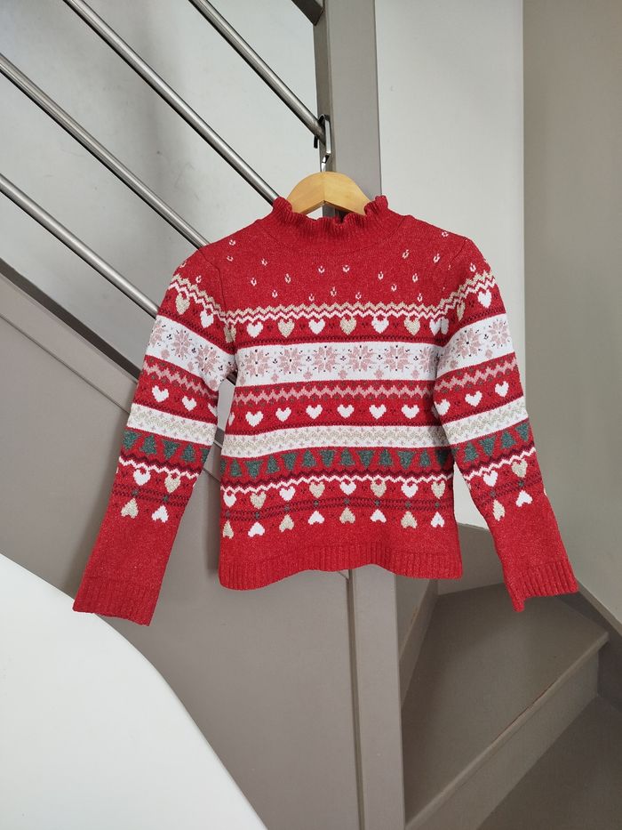 Pull de Noël rouge à détails brillants et colorés. Joli col. Marque Tissaia, taille 8 ans. Réduction activée sur les lots. #fille #pull #pulldenoel #tissaia #8ans