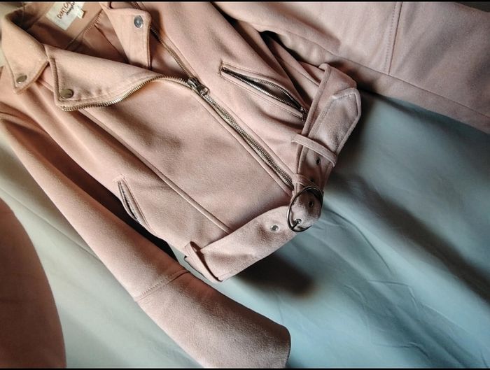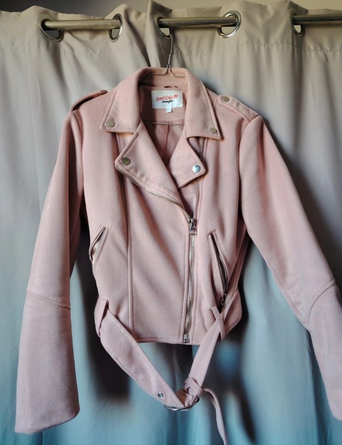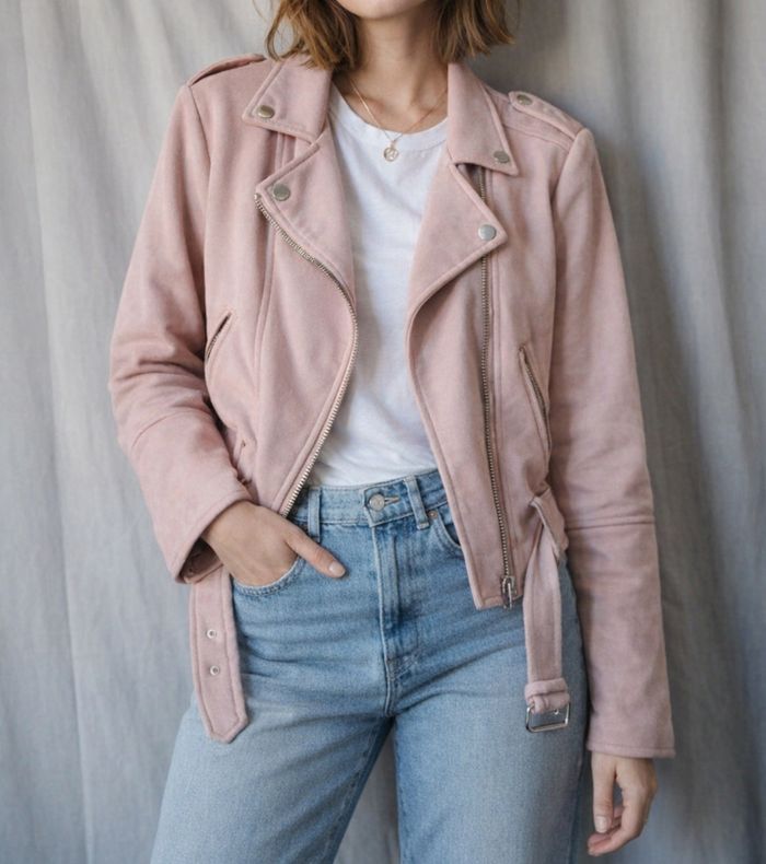Veste biker en suédine rose poudré, coupe parfaite et détails argentés. Très bon état, portée seulement quelques fois. Douce, confortable et idéale pour le printemps.