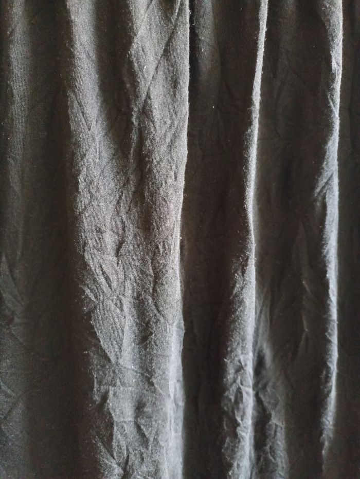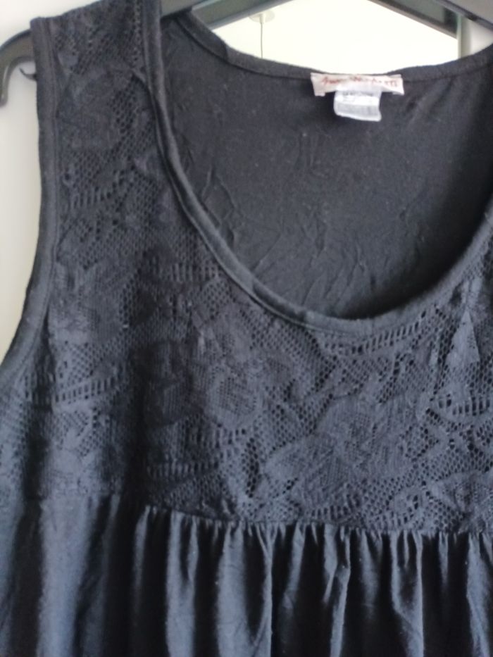 Robe noire fluide effet froissé avec haut dentelle Marque : Anne Weyburn Taille : 40 Bon état car bouloché sous les bras (voir photos) Dimensions : _ Largeur double aisselles : 49 cm _ Longueur : 100 cm 100% polyester